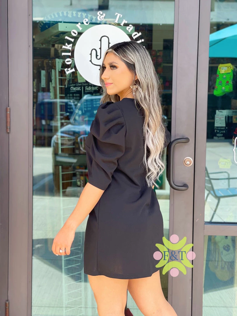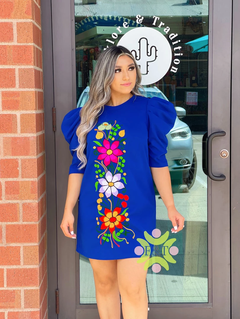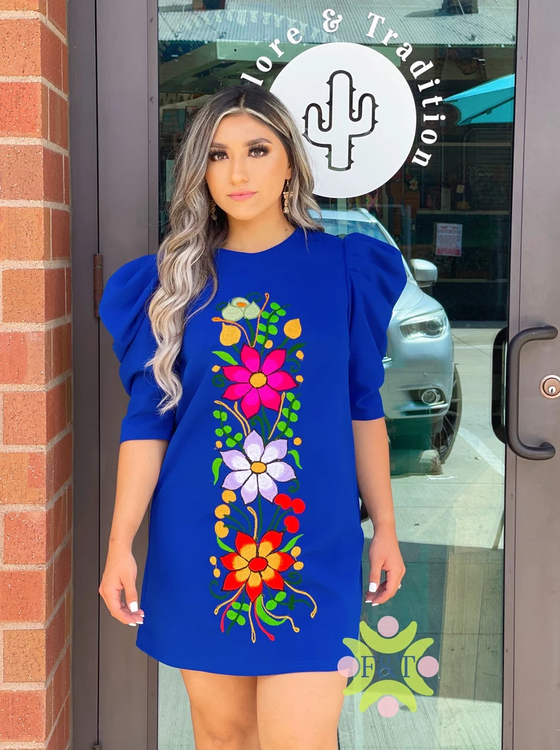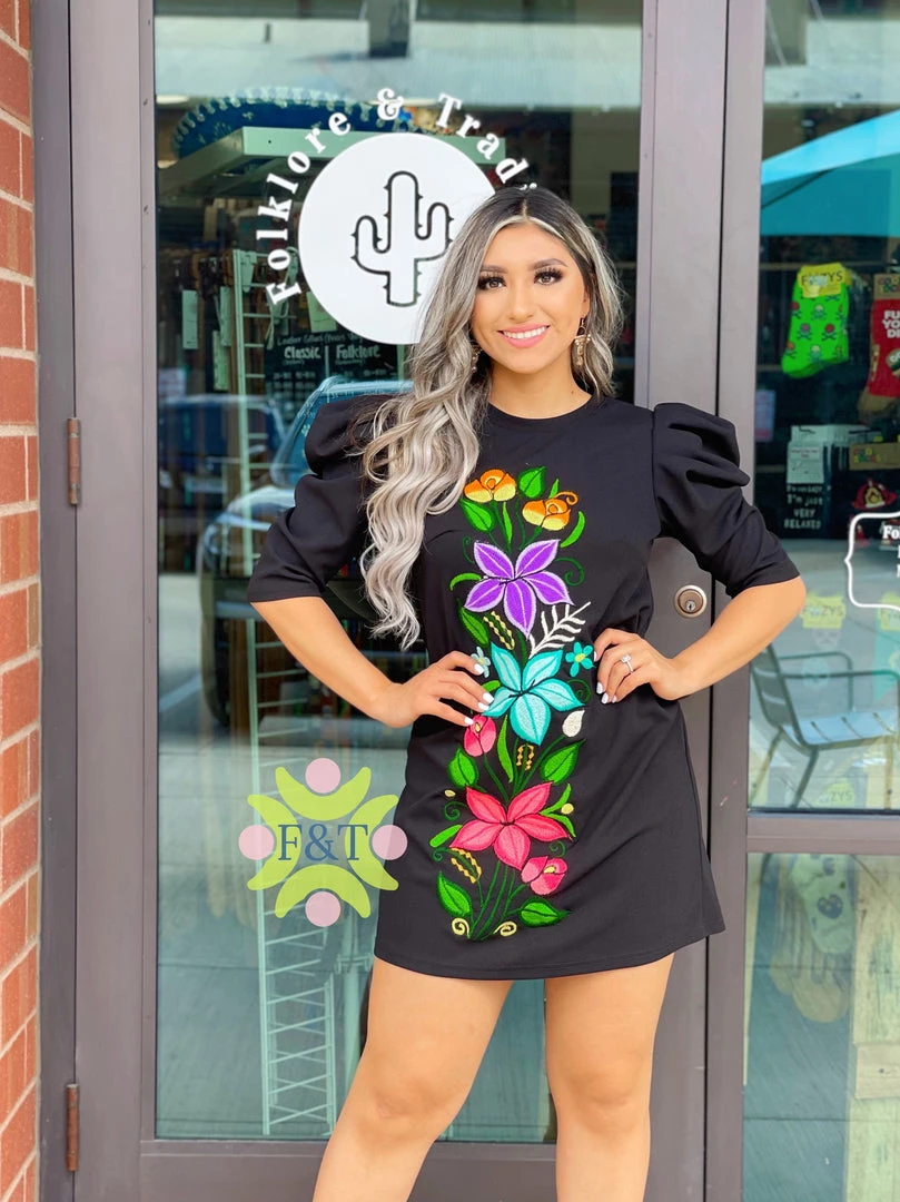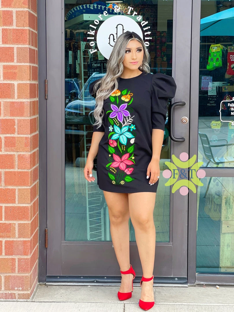Mini dress handmade with one of a kind floral embroidery throughout the front, finished with elegant puff-sleeves.