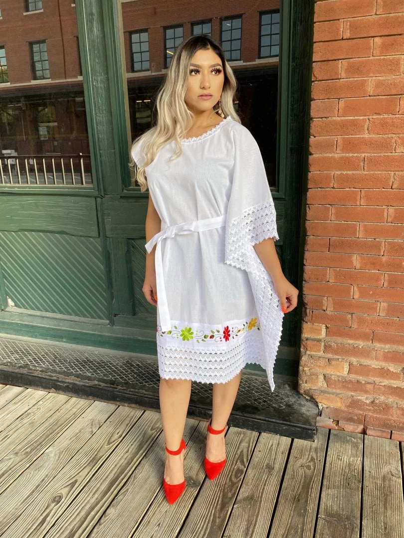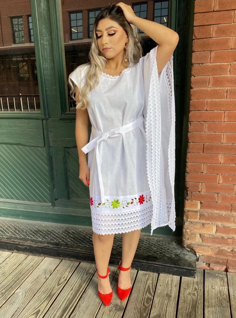 Super modern cut dress with hand embroidery along the bottom, a must have for your wardrobe!