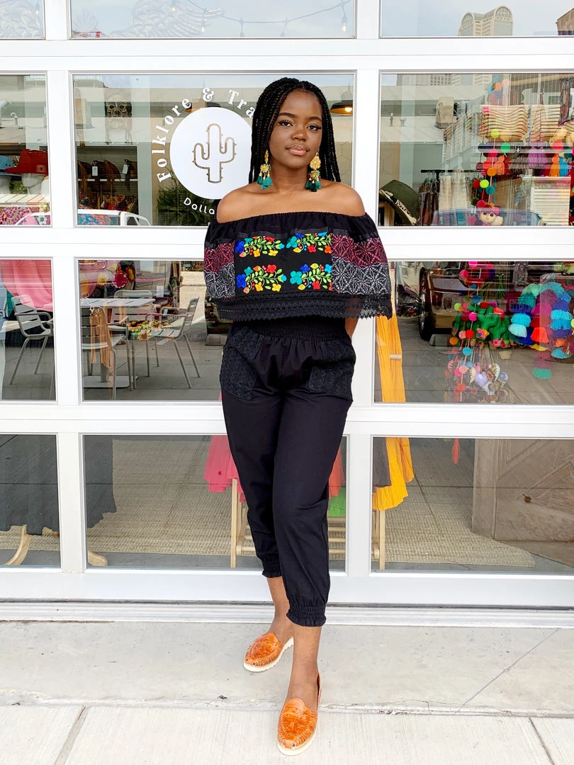 An off-shoulder jumper, completely handmade with beautiful silk embroidery, fresh fabric, elastic waist + ankles/legs, and lace detailing.
