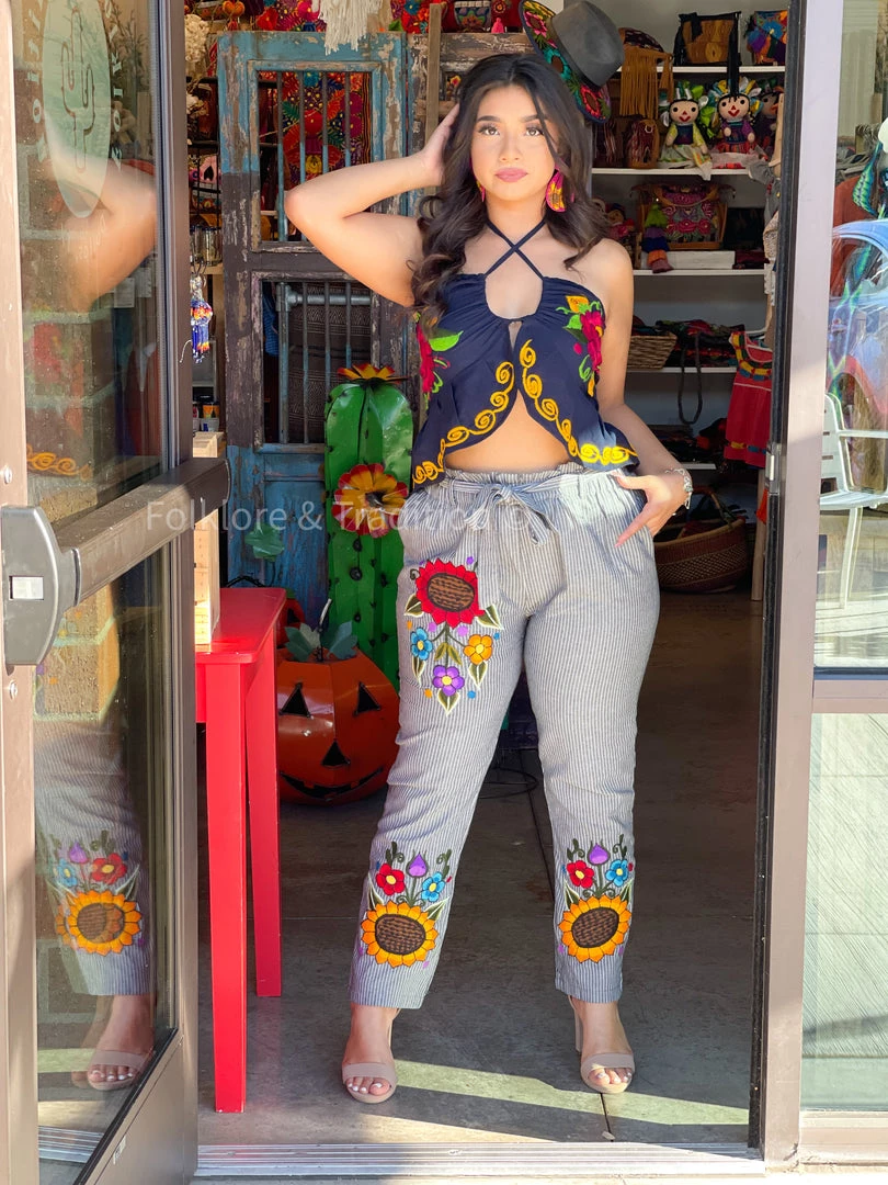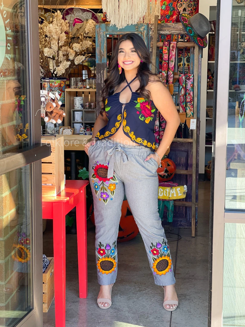 Softly comfortable pants, one of a kind embroidery, expect variations.
