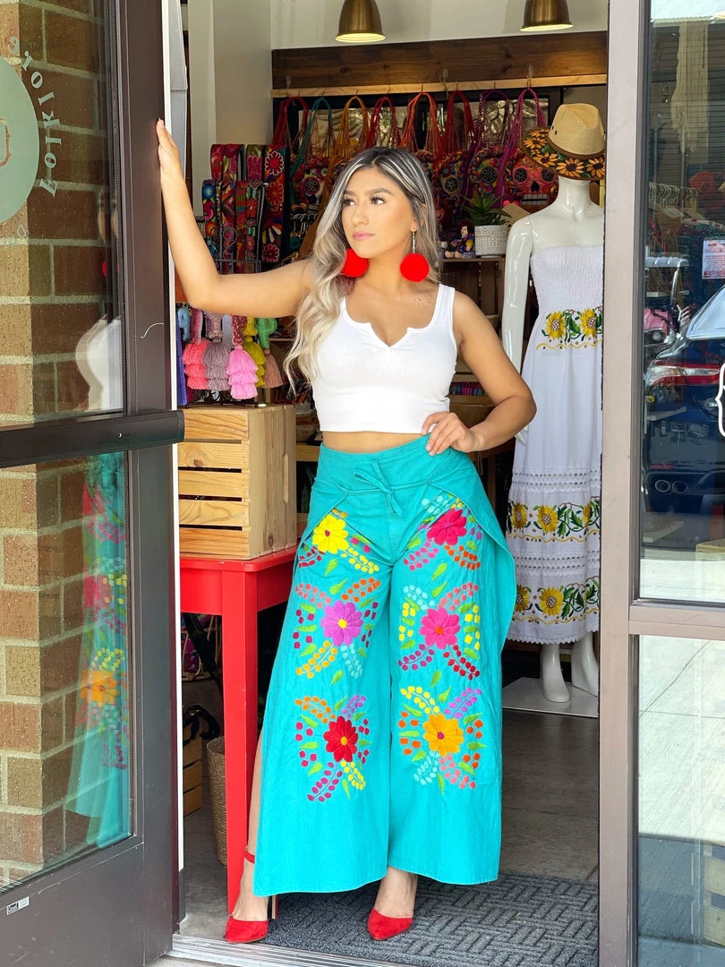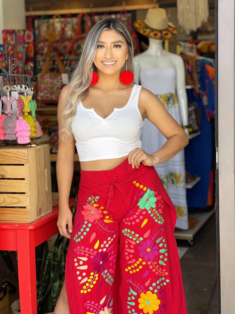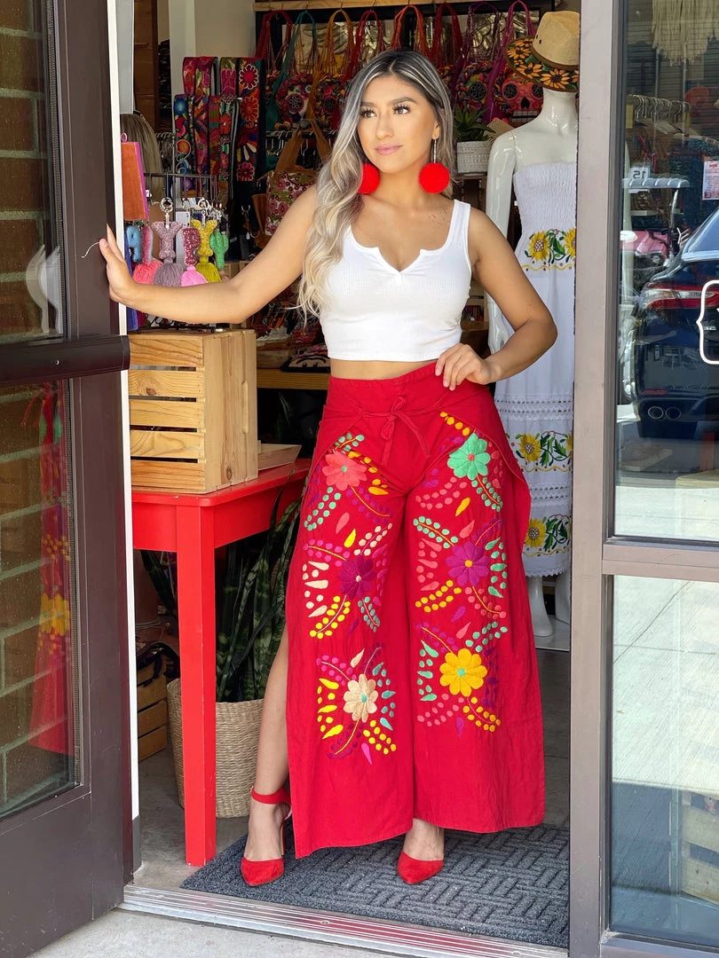 Hand embroidered Señorita pants with breathtaking floral details and fun open slits on the sides, perfect for summertime!