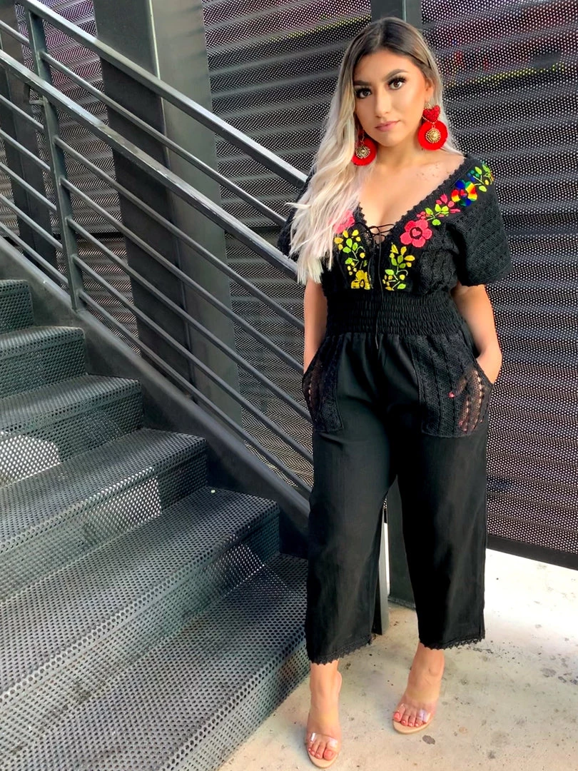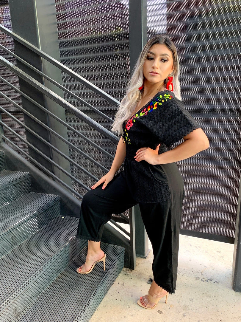 A fun floral short sleeved jumper embroidered with bright cotton thread over breathable linen and an elastic waist. The perfect jumper for summer time!