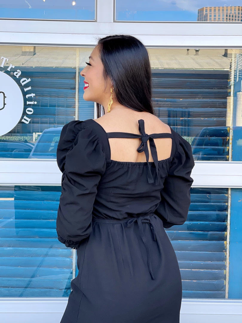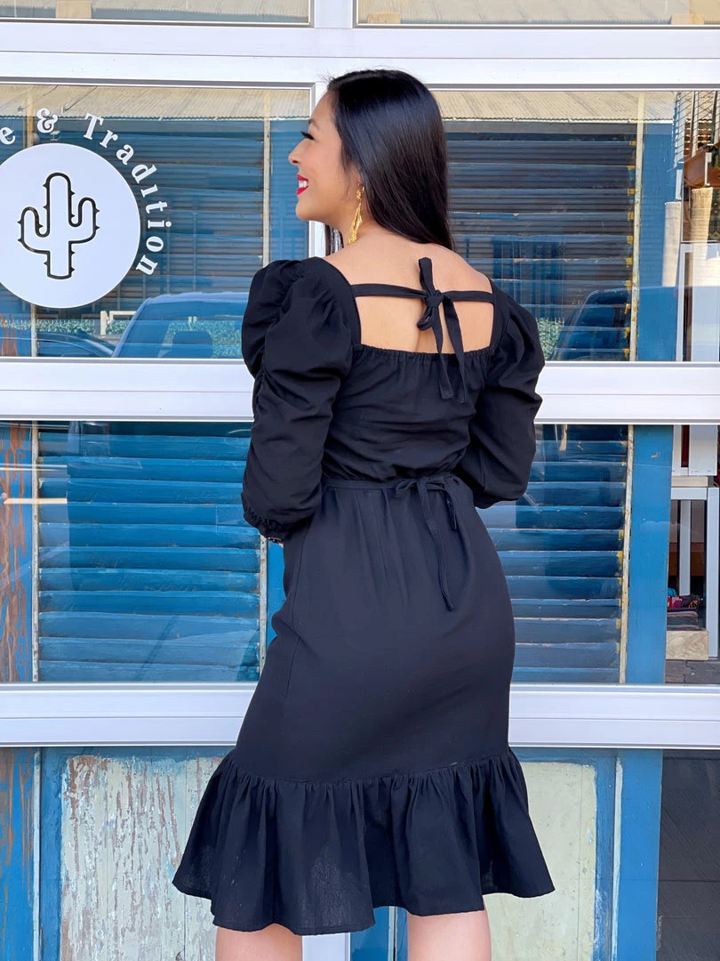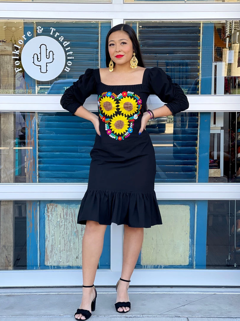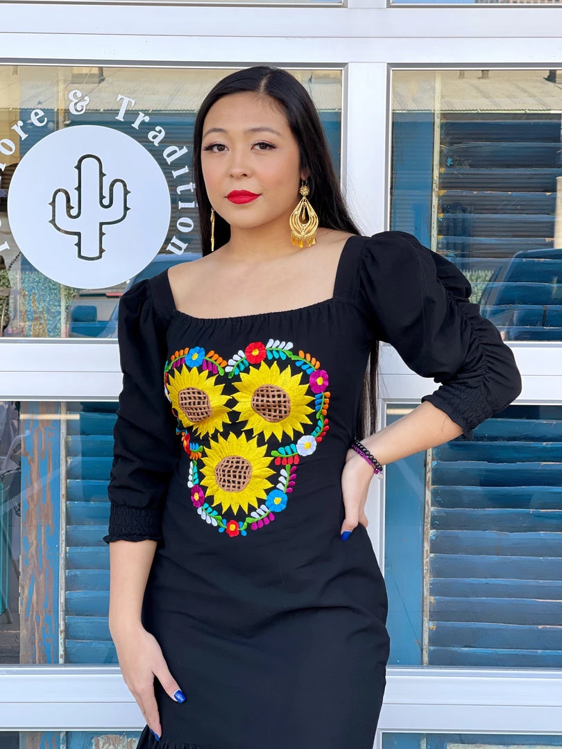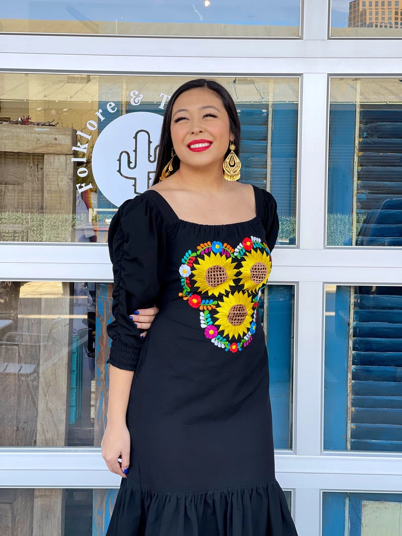 Beautiful sunflower dress made with modern puff-sleeves, a ruffled bottom trim, waist ties, and gorgeous back straps.