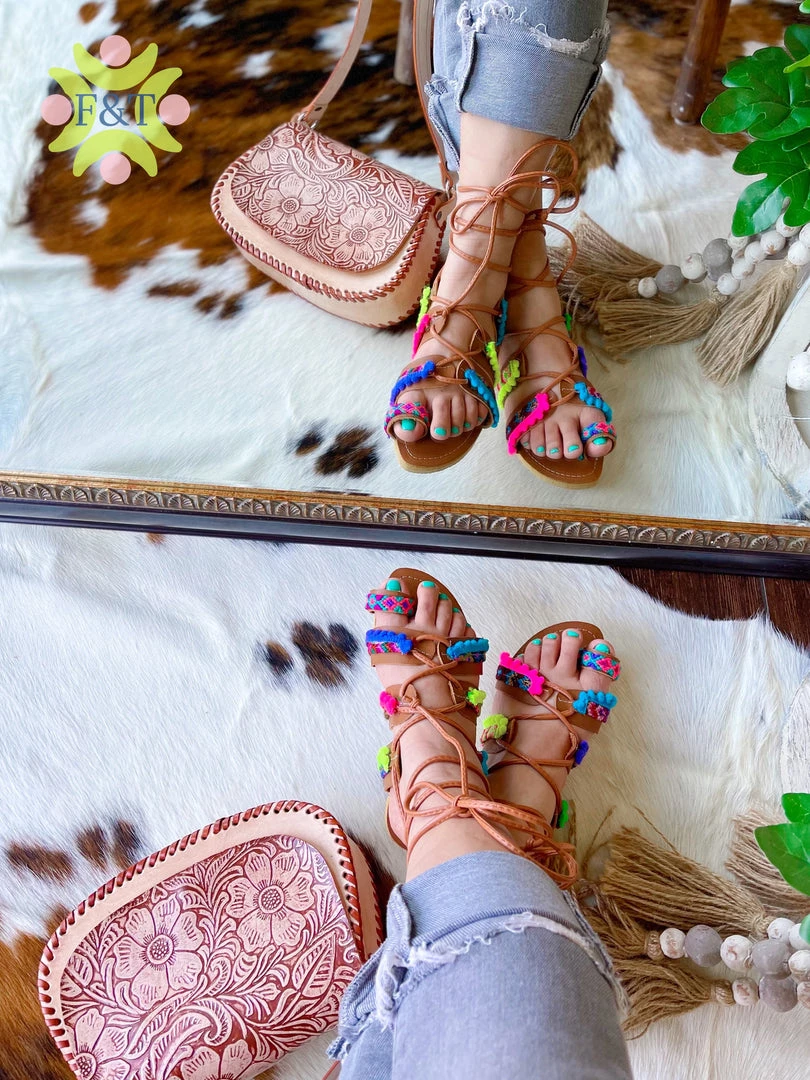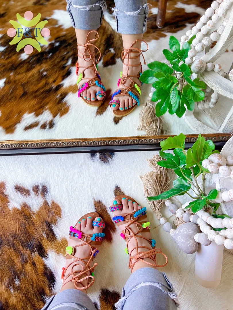 Sandals made with genuine leather, bright confetti colored designs, and mini pom poms!