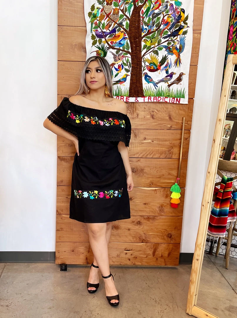 Off-shoulder dress handmade with silk embroidery + lace trim. Dress includes two straps on waist for a fitted look.