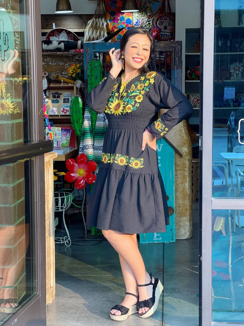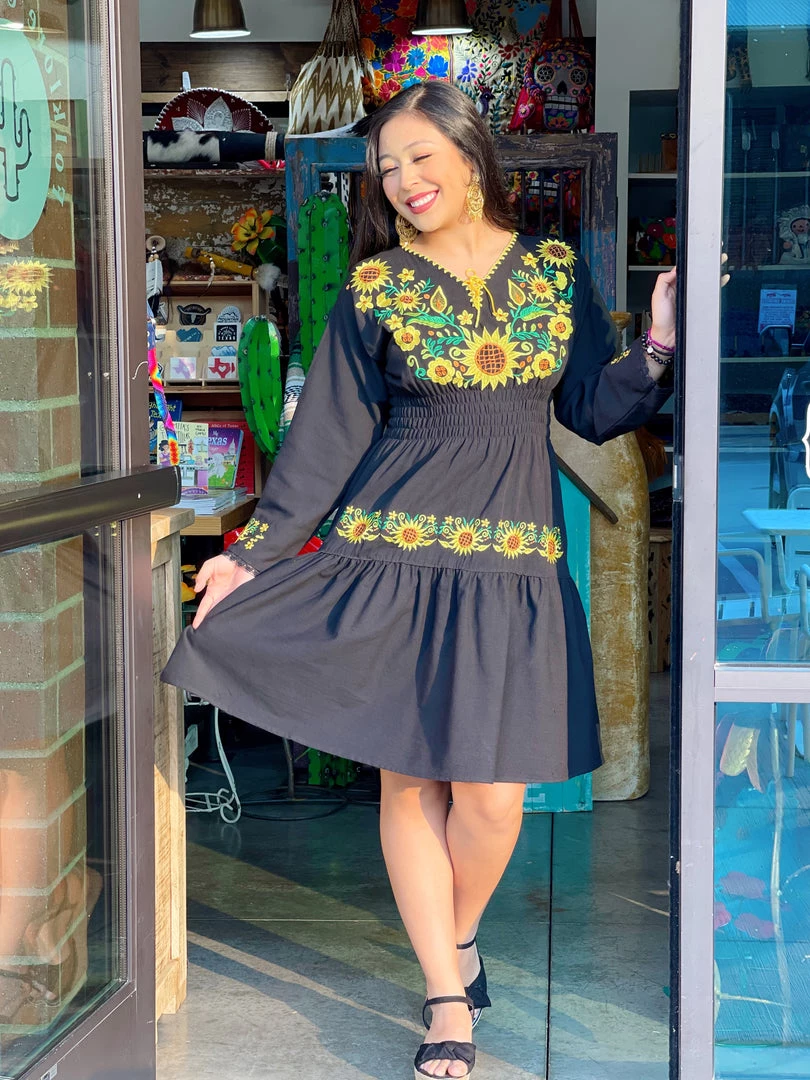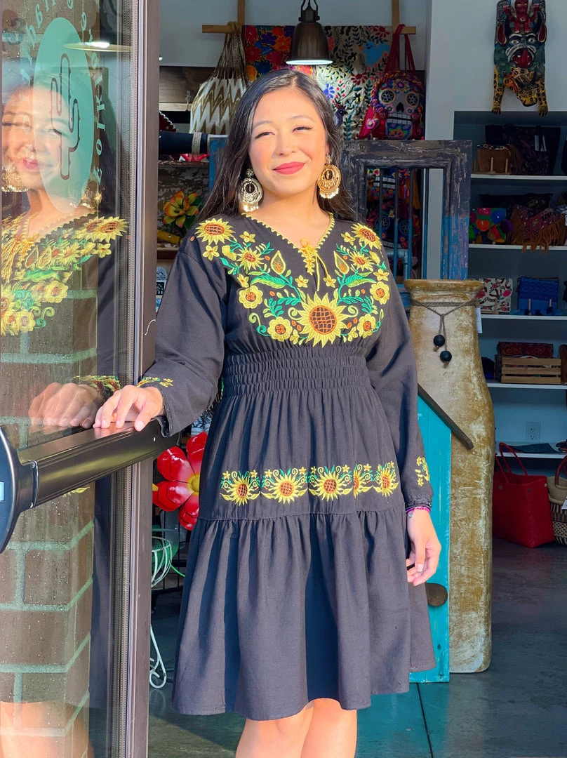 Sunflower embroidery throughout the front, elastic on the waist, and straps on the chest.