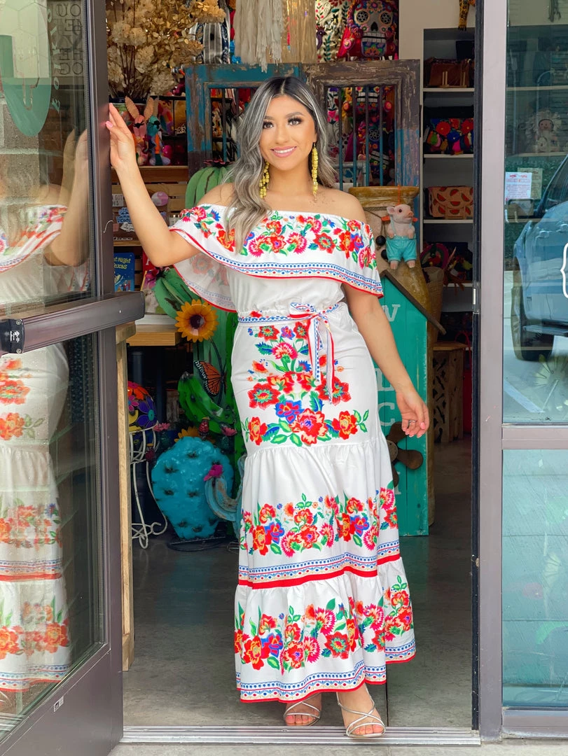 A fun maxi dress made with print floral patterns and an extravagant dress design. Elastic waist, off shoulder, belt included.