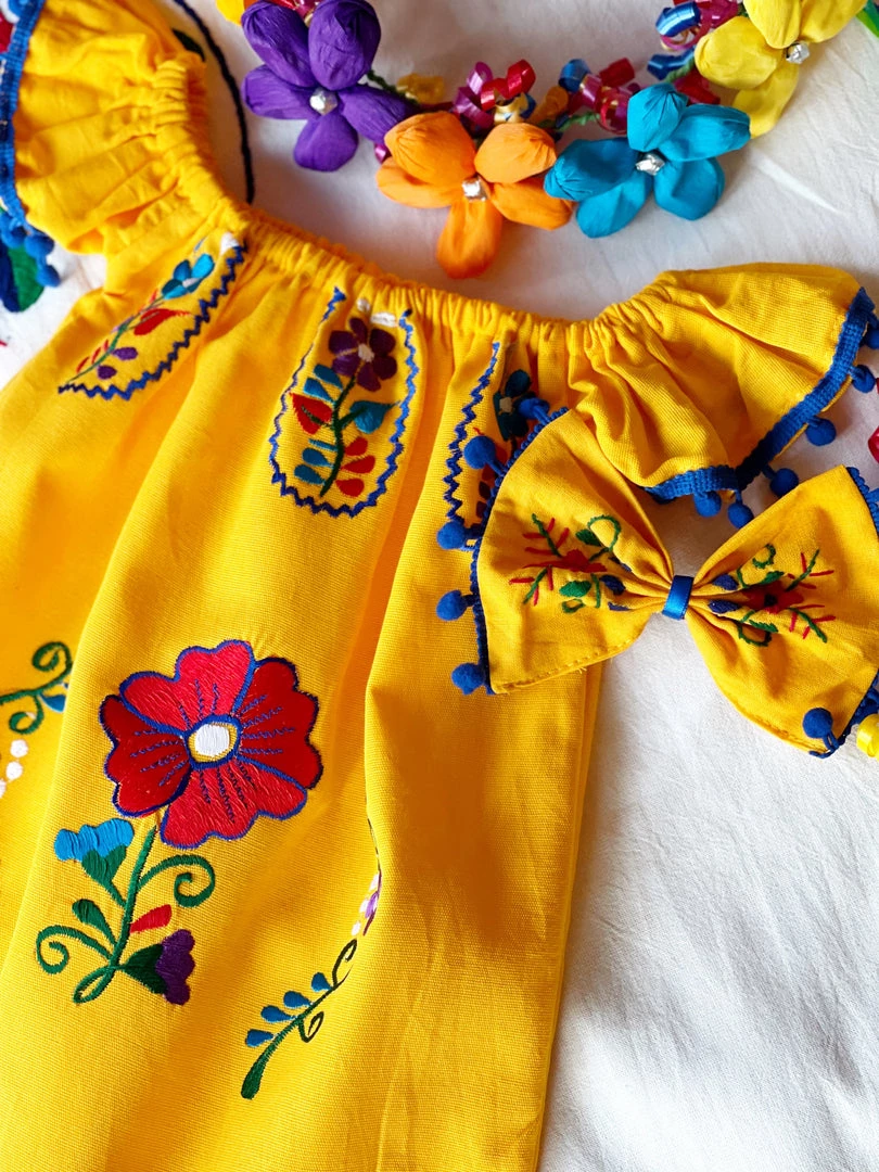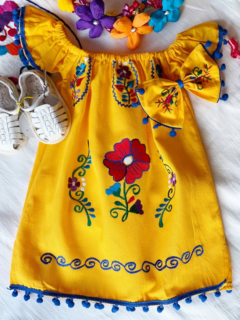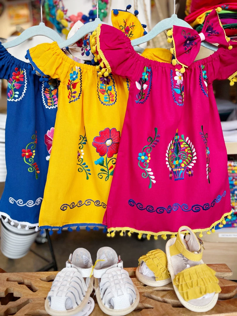 Floricita Two Piece Set is the cutest one yet! Set includes floral embroidered dress with pom pom on the ends and it’s very own hand embroidered matching bow!