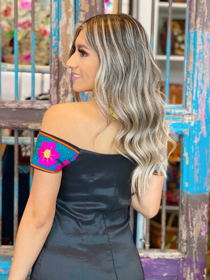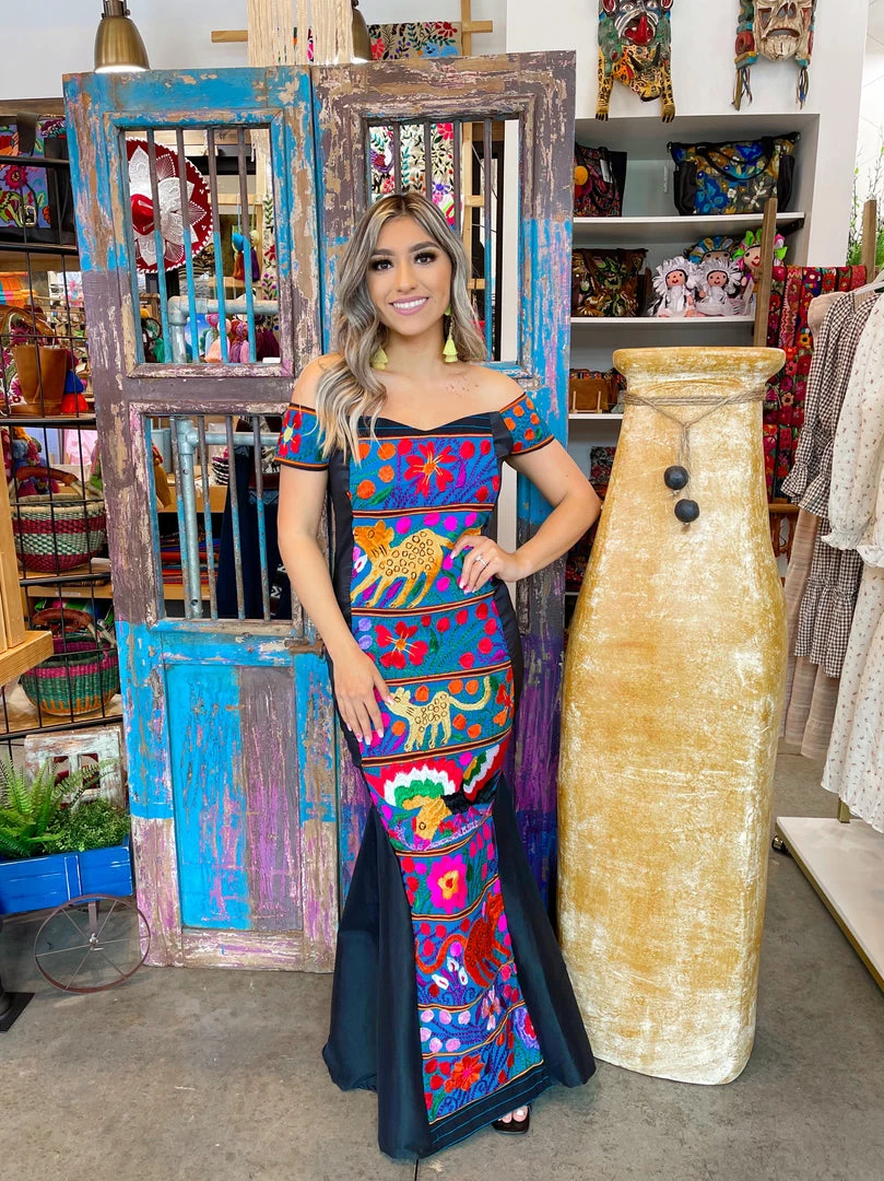 Delicately hand embroidered with silk thread, fitted off-shoulder mermaid dress, comfortable stretchy material.