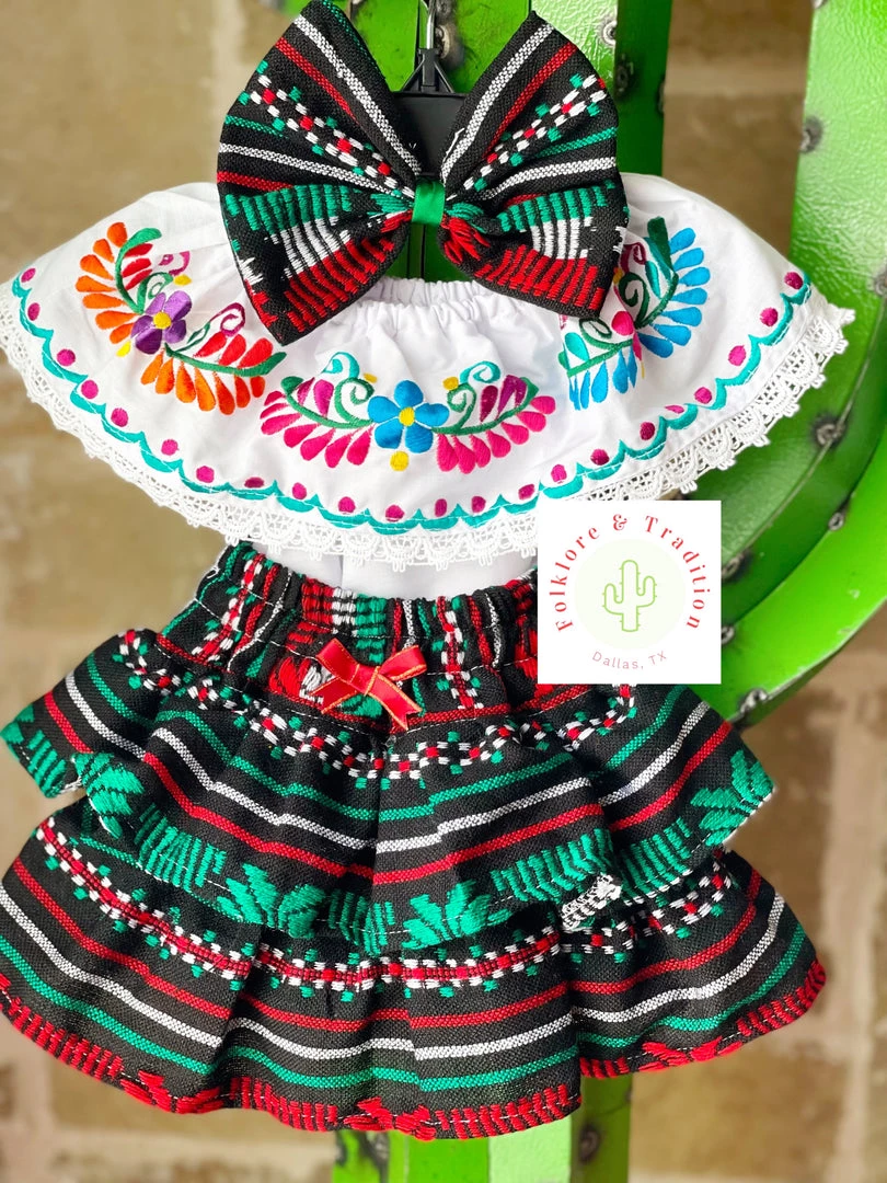 A brightly colored Folklore Fiesta 3-Piece Set. Set includes, ruffled underwear skirt, embroidered off-shoulder top, and a fluffy hair bow pin.