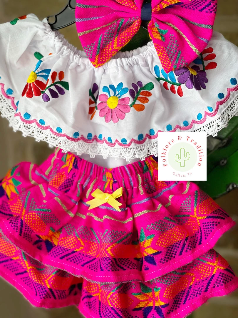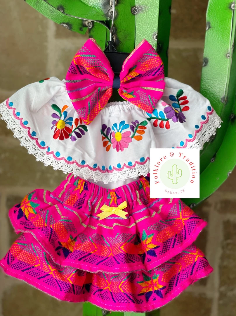 A brightly colored Folklore Fiesta 3-Piece Set. Set includes, ruffled underwear skirt, embroidered off-shoulder top, and a fluffy hair bow pin.
