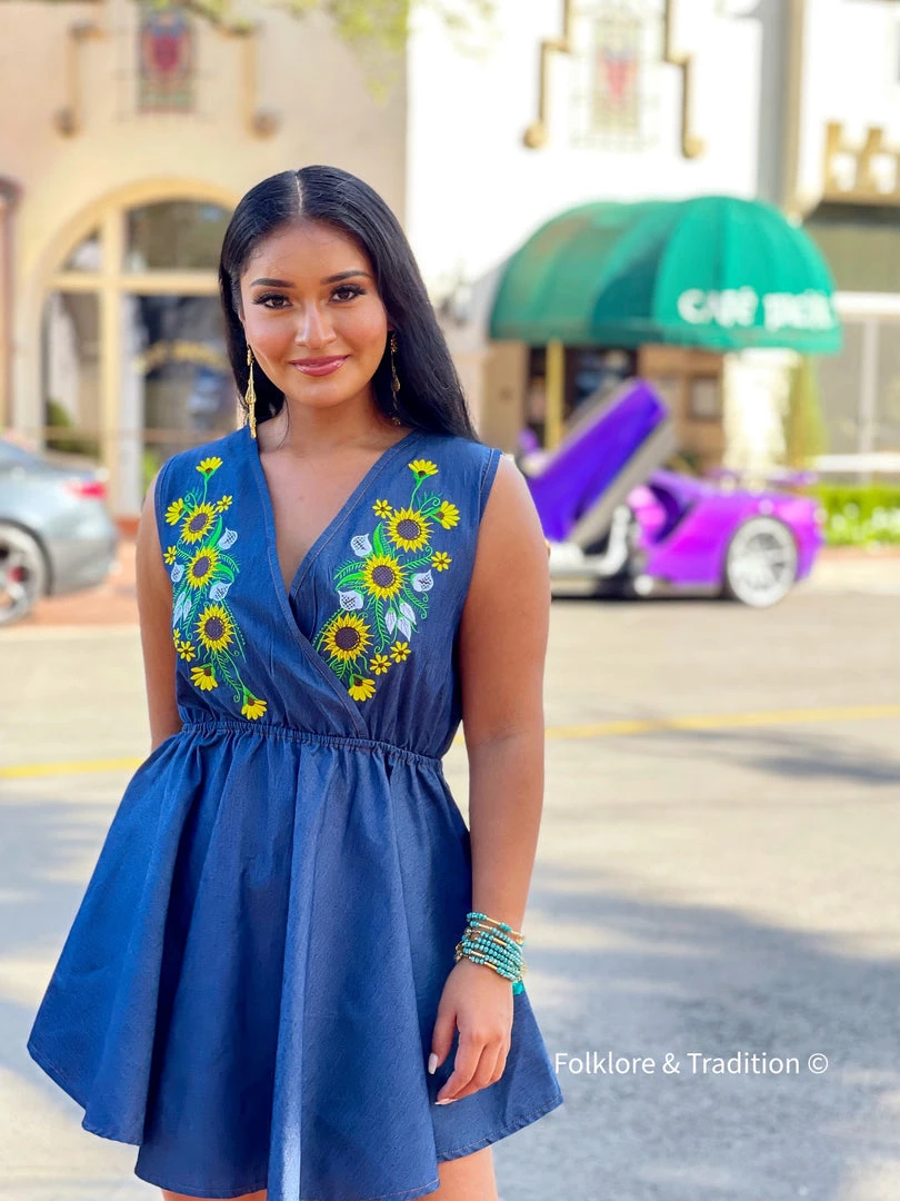 Beautiful sunflower dress with a fun rounded bottom skirt. This dress is fun, flowy, and fresh for any time of day.