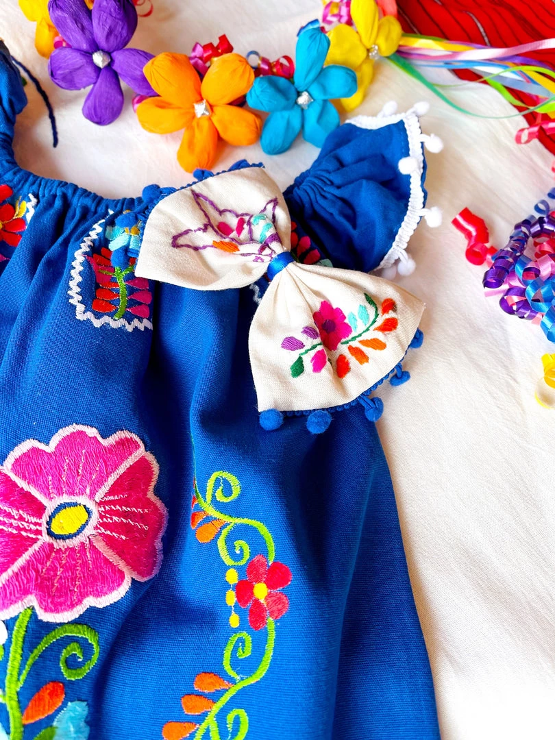 Floricita Two Piece Set is the cutest one yet! Set includes floral embroidered dress with pom pom on the ends and it’s very own hand embroidered matching bow!