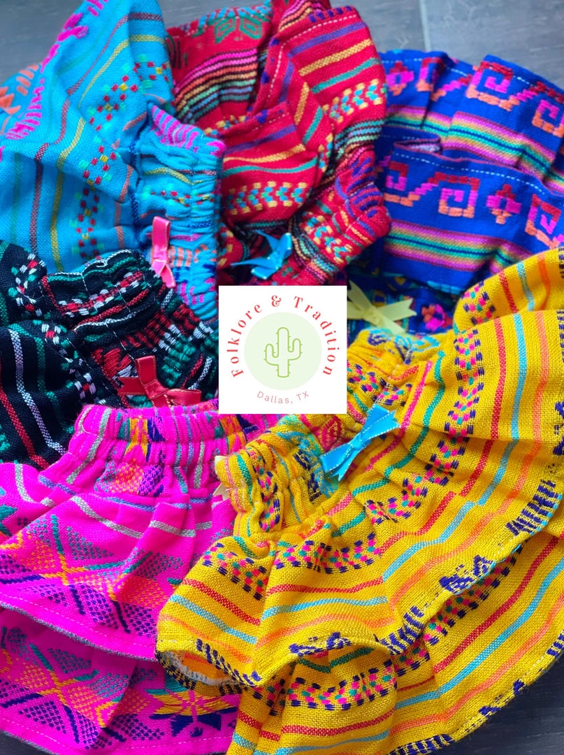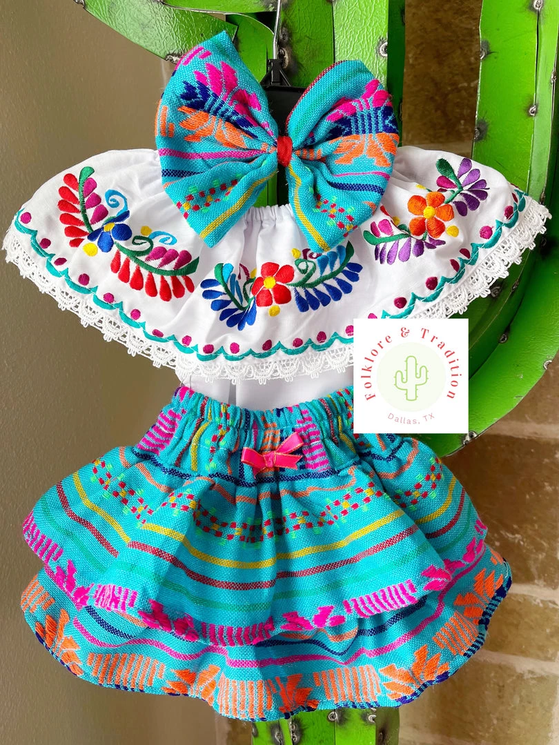 A brightly colored Folklore Fiesta 3-Piece Set. Set includes, ruffled underwear skirt, embroidered off-shoulder top, and a fluffy hair bow pin.