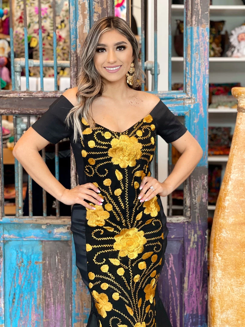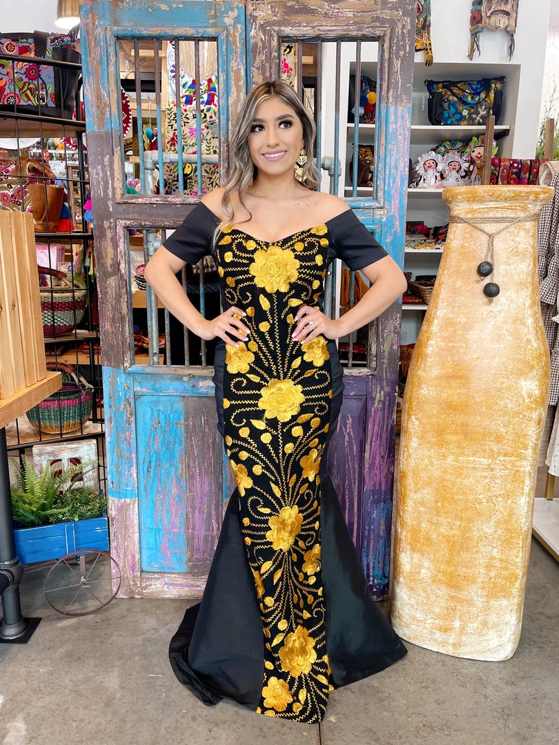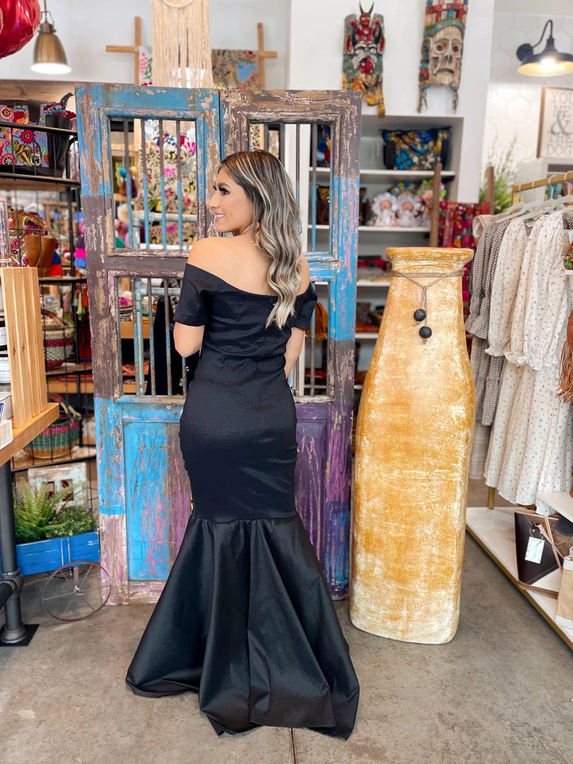 Delicately hand embroidered with silk thread, fitted off-shoulder mermaid dress, comfortable stretchy material.