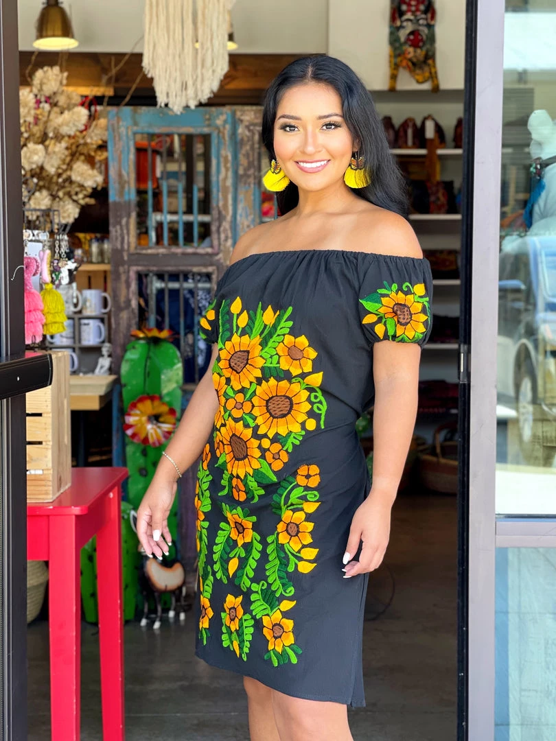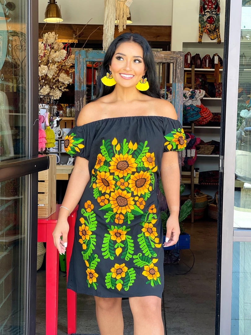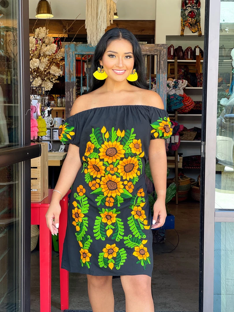 A fun sunflower dress perfect for any time of day! Elastic sleeves + adjustable waist (straps).