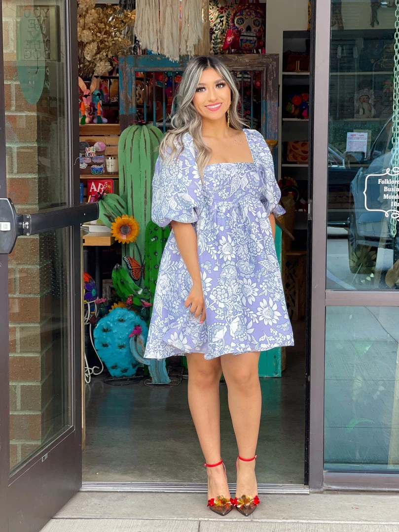 This gorgeous mini dress is stunning with beautiful floral print patterns, a square neckline, puffy sleeves, and a zipper for a fitted look and on/off access.