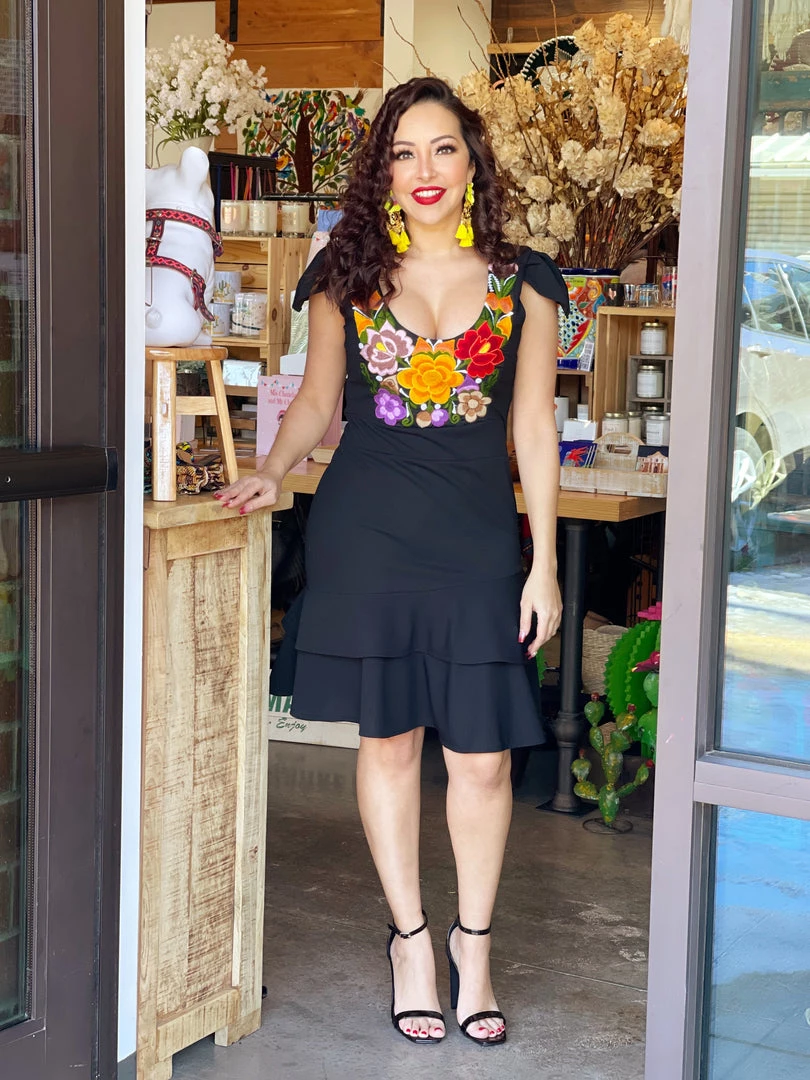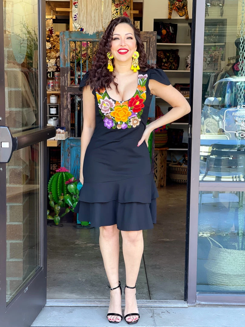 One of a kind embroidery over a gorgeous modern sophisticated dress. Expect variation in embroidery as they’re one of a kind pieces.