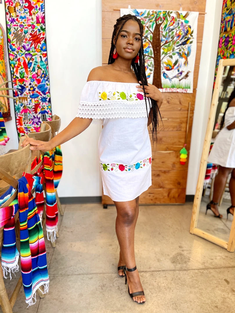 Off-shoulder dress handmade with silk embroidery + lace trim. Dress includes two straps on waist for a fitted look.