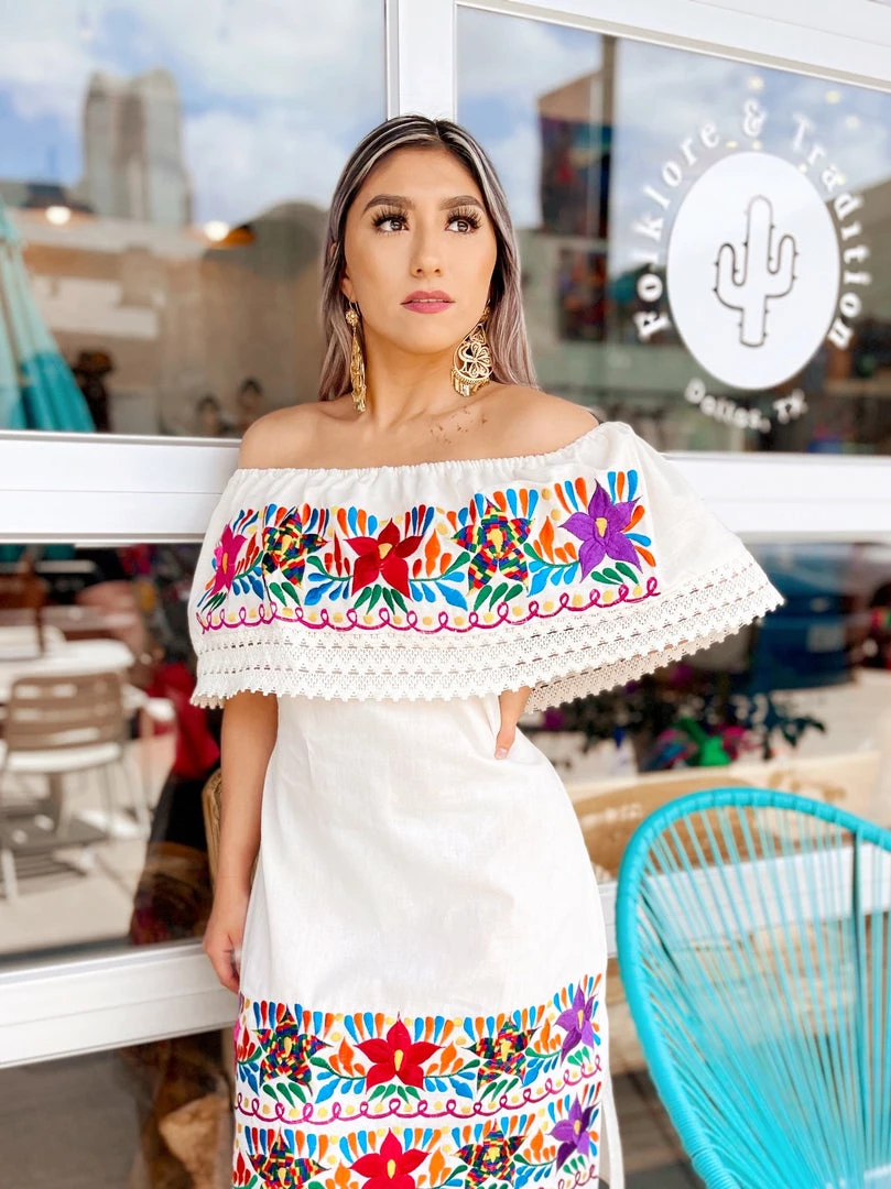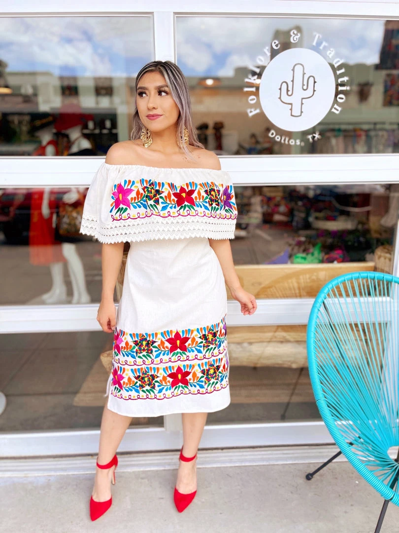 Our NEWEST off-shoulder dress made with brightly colored floral embroidery.