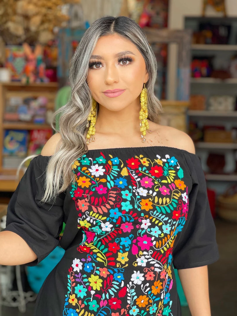 100% Hand embroidered with multicolored cotton thread. Ties in the back.