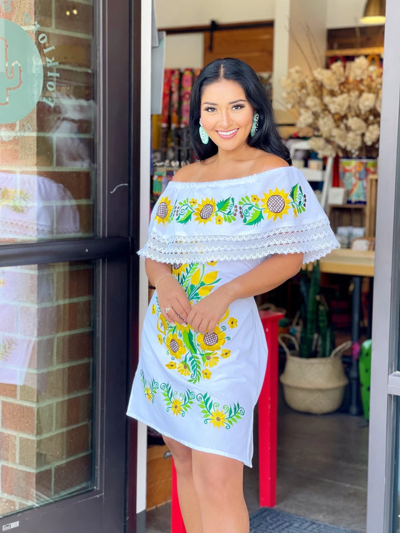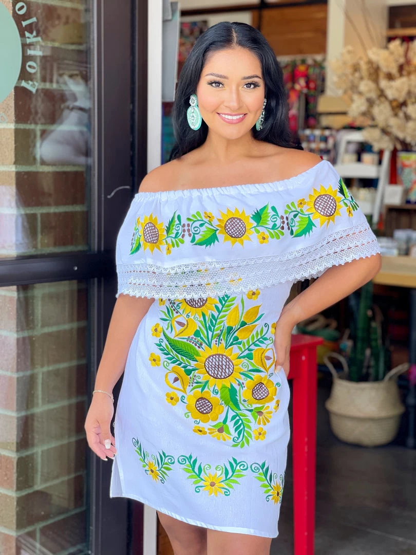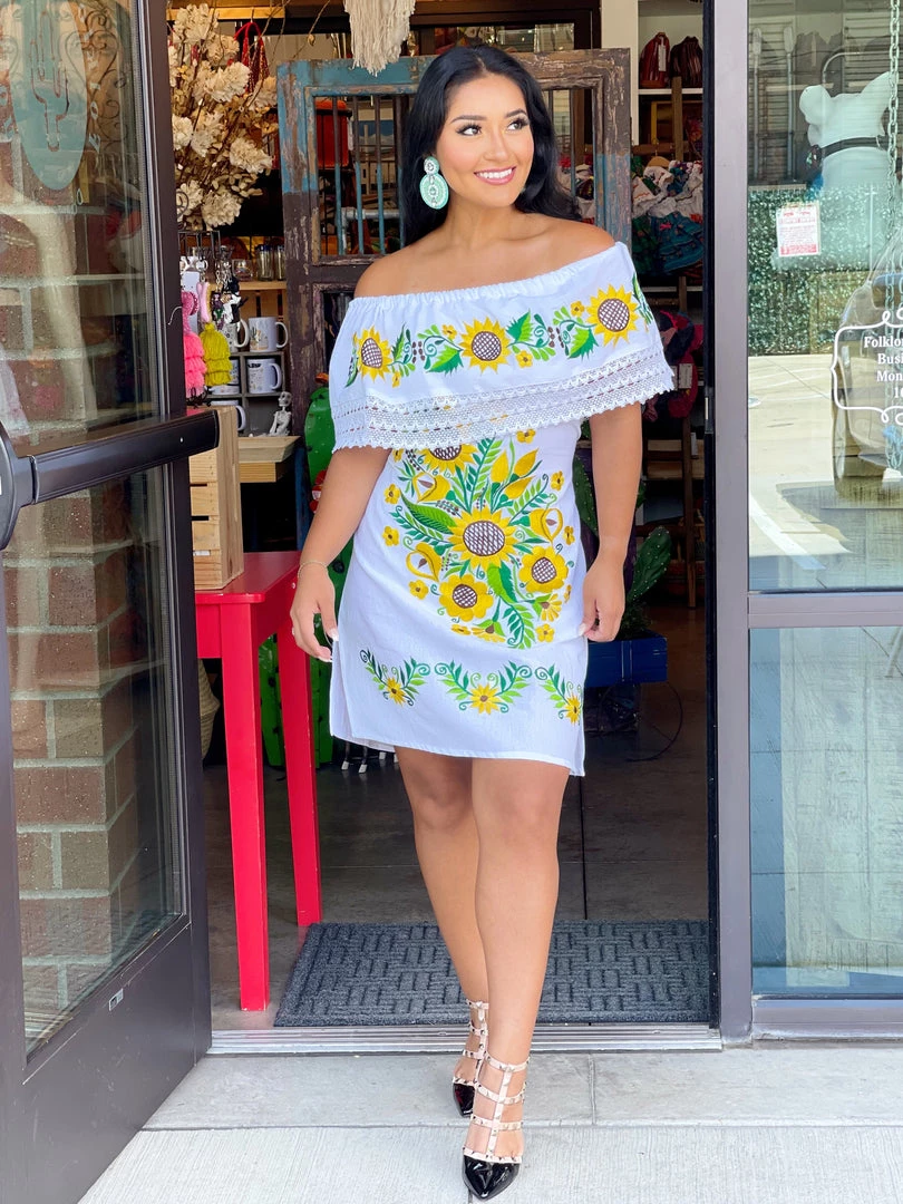 Paulina off-shoulder is a cute sunflower dress made with very detailed embroidery + sexy lace.