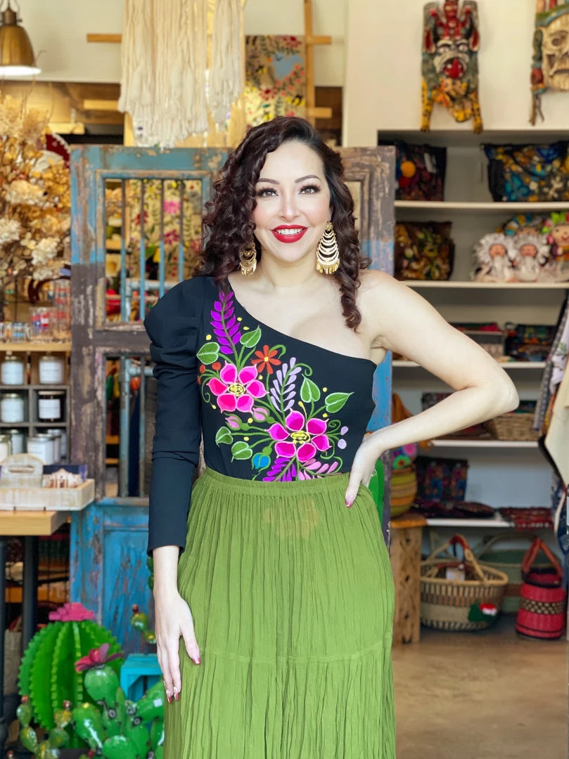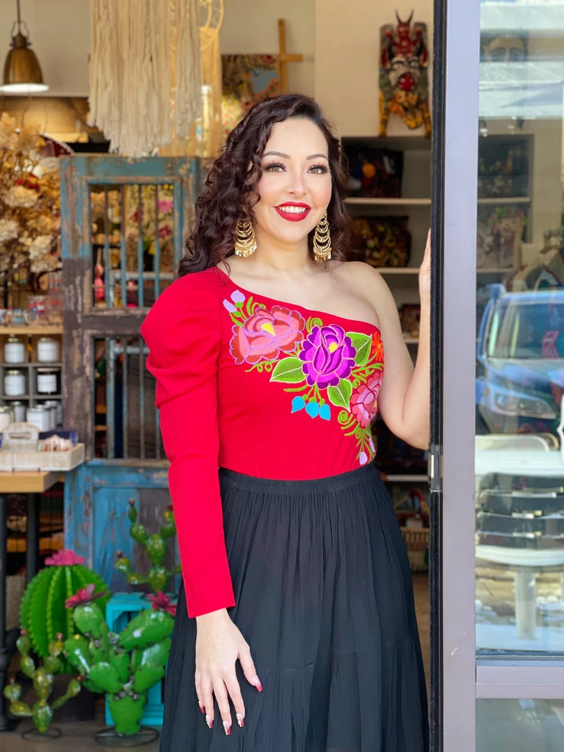 This bodysuit top is absolutely stunning with one of a kind floral embroidery and a gorgeous puff-sleeve. Material is stretchy.