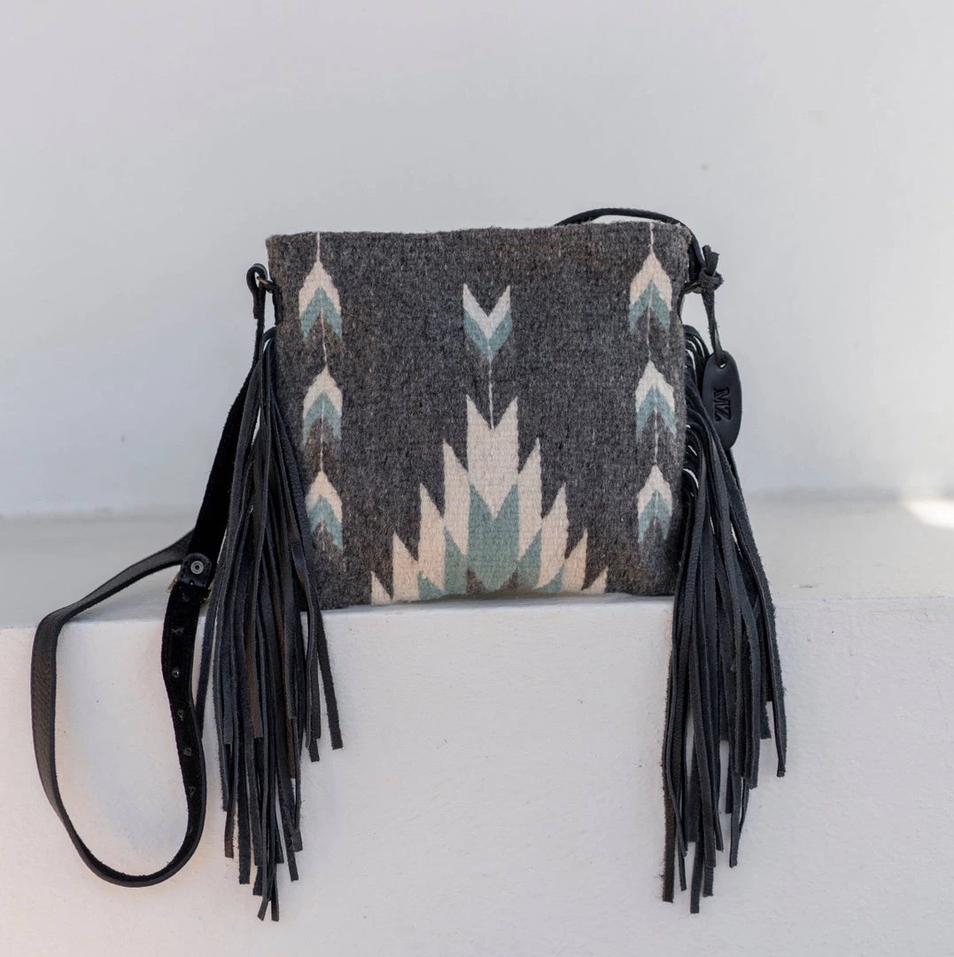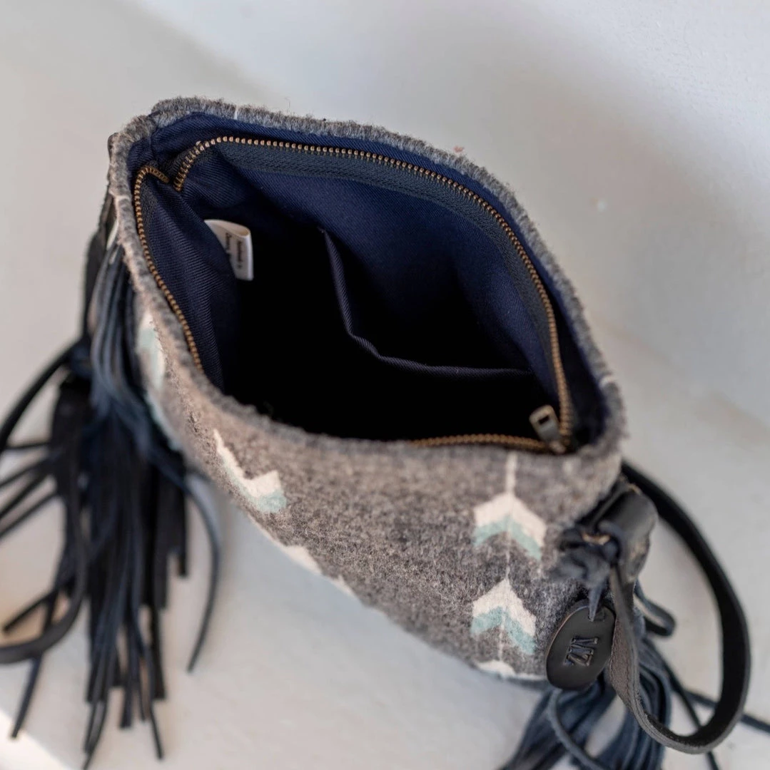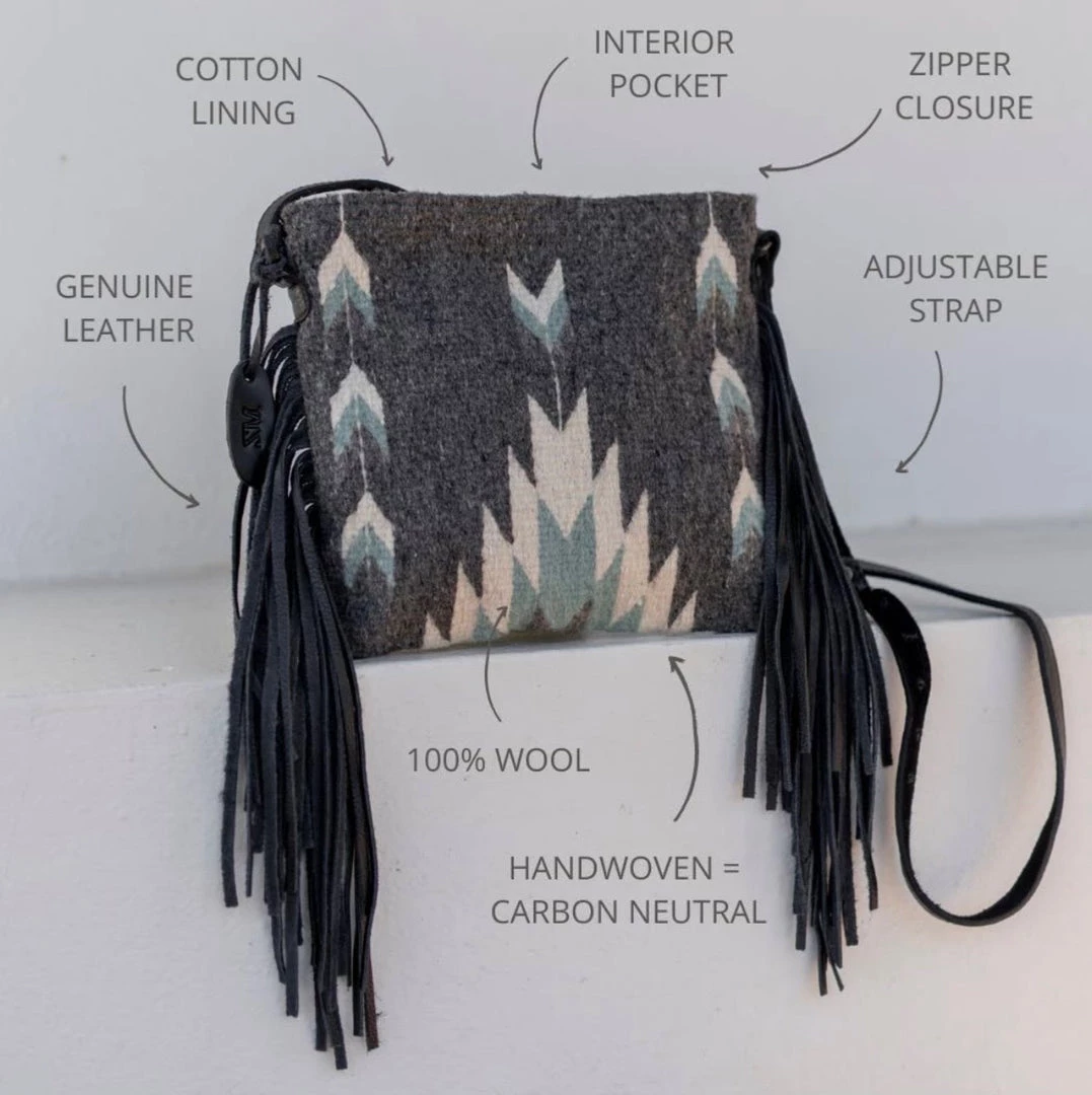 The features: adjustable leather strap, zipper closure and lined interior with one pocket.