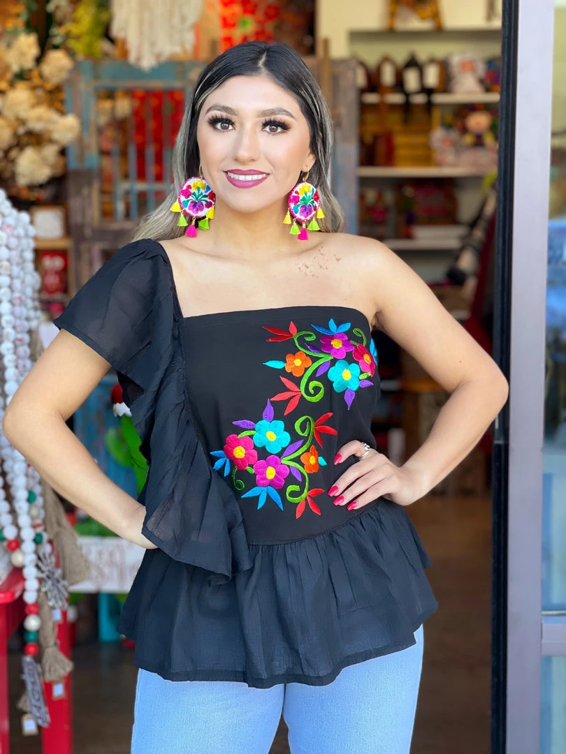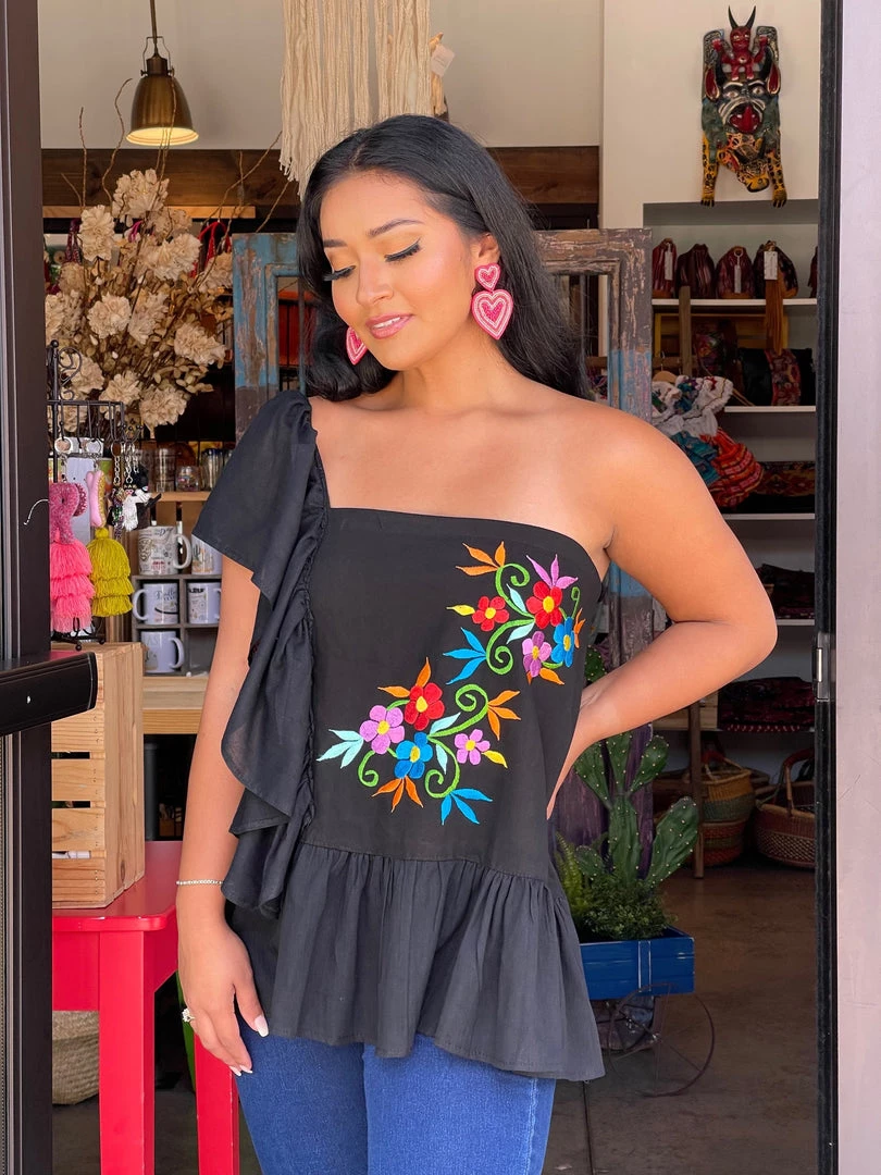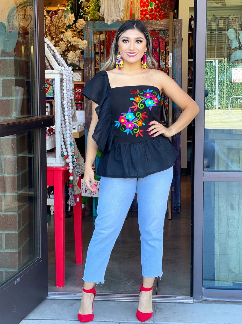 A gorgeous one shoulder top perfect for any time of day. This top is made with one of a kind embroidery and a ruffled sleeve to give you a sophisticated look.