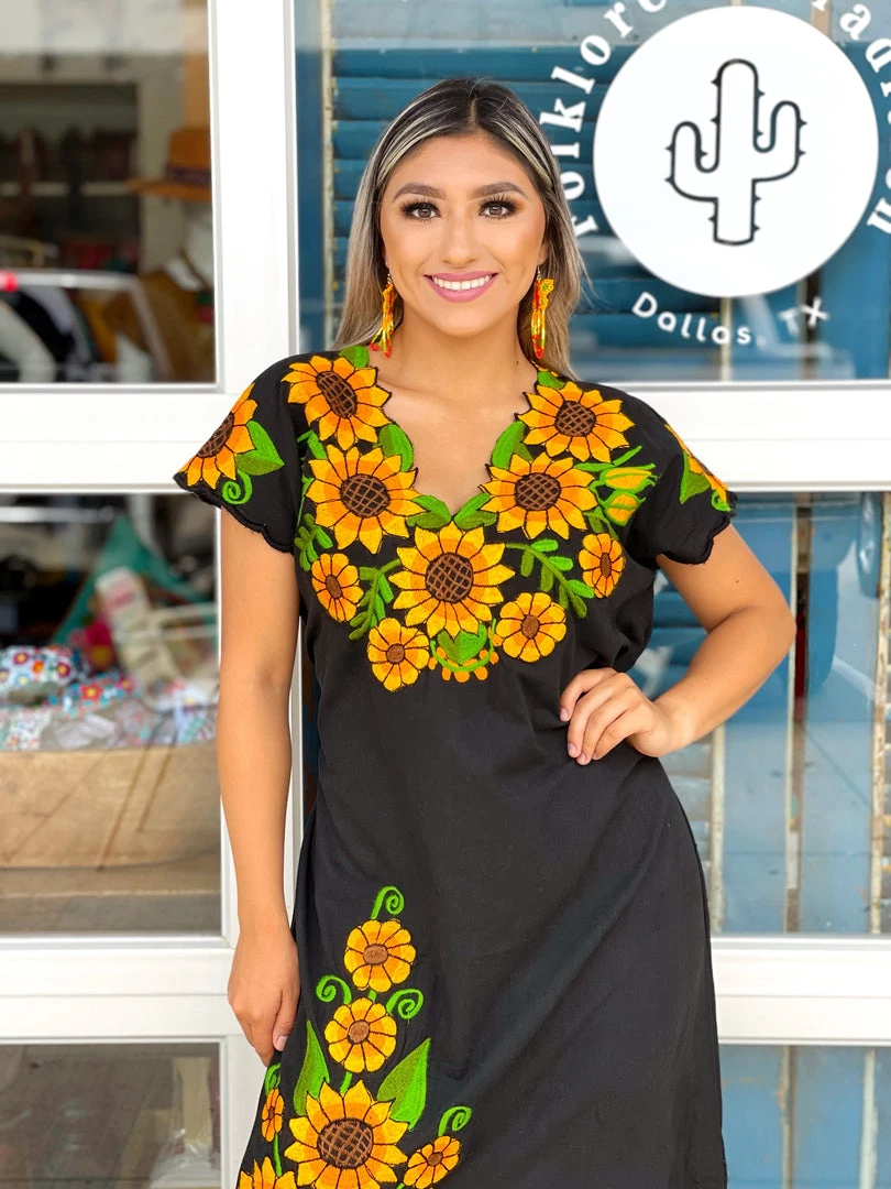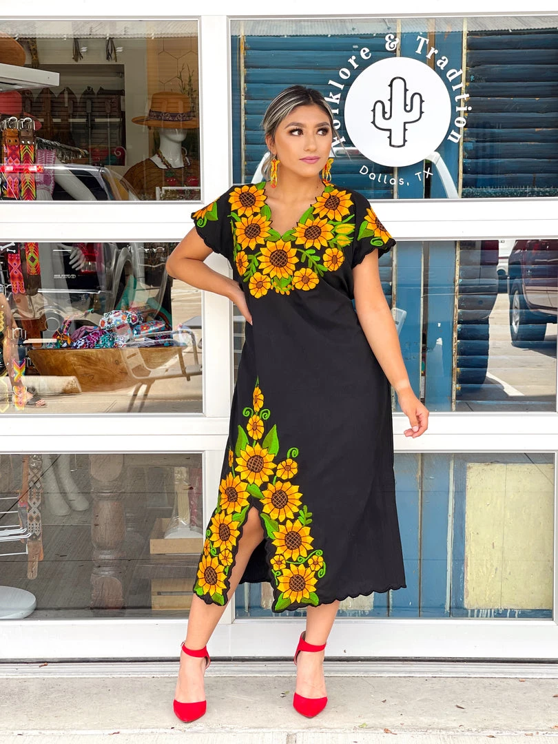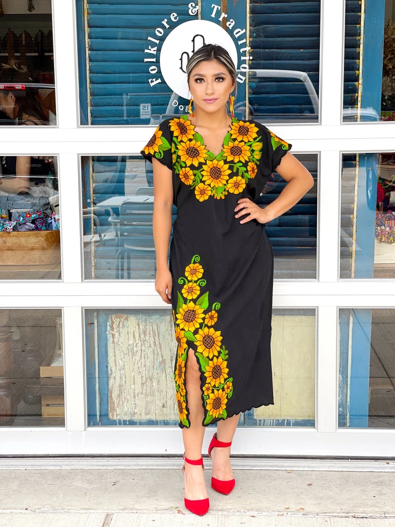 Beautiful sunflower dress made with floral details on the neckline + throughout the open leg slit.
