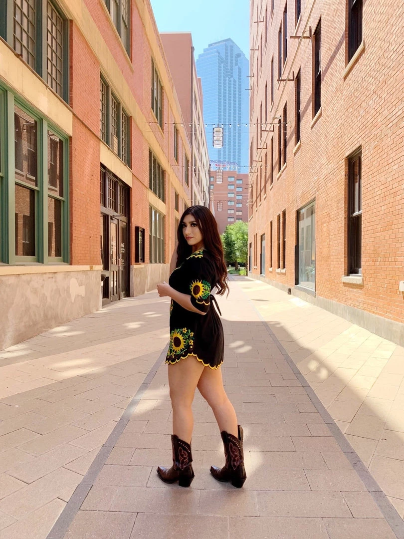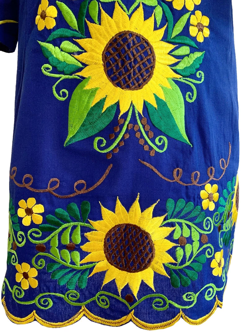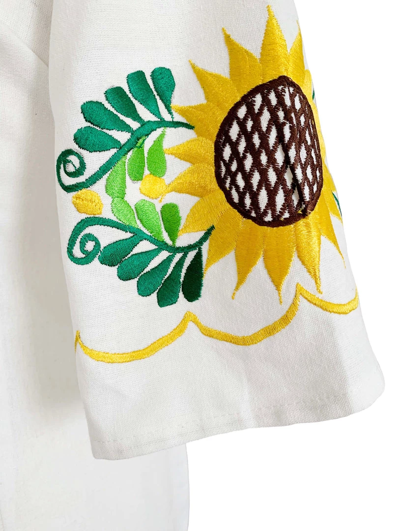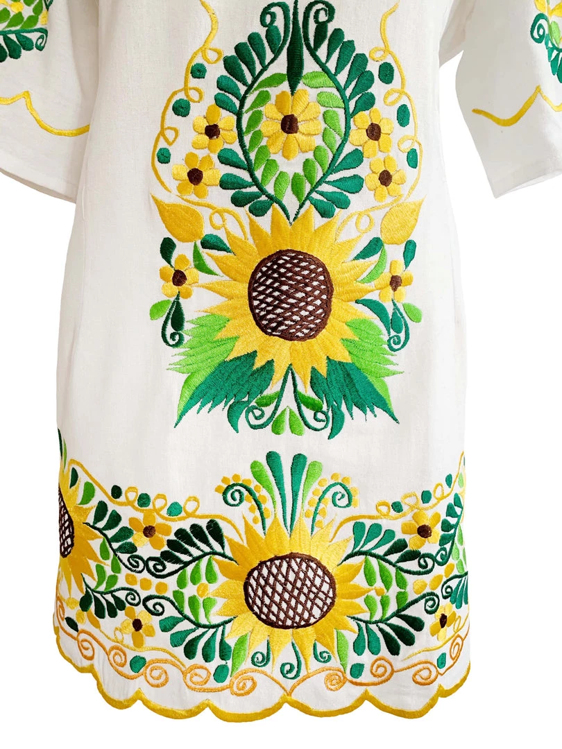 A gorgeous mid sleeve dress with a variety of vibrant sunflowers! Our dress is made with fresh linen fabric and hand-guided machine embroidery. A great way to shine and look your best!