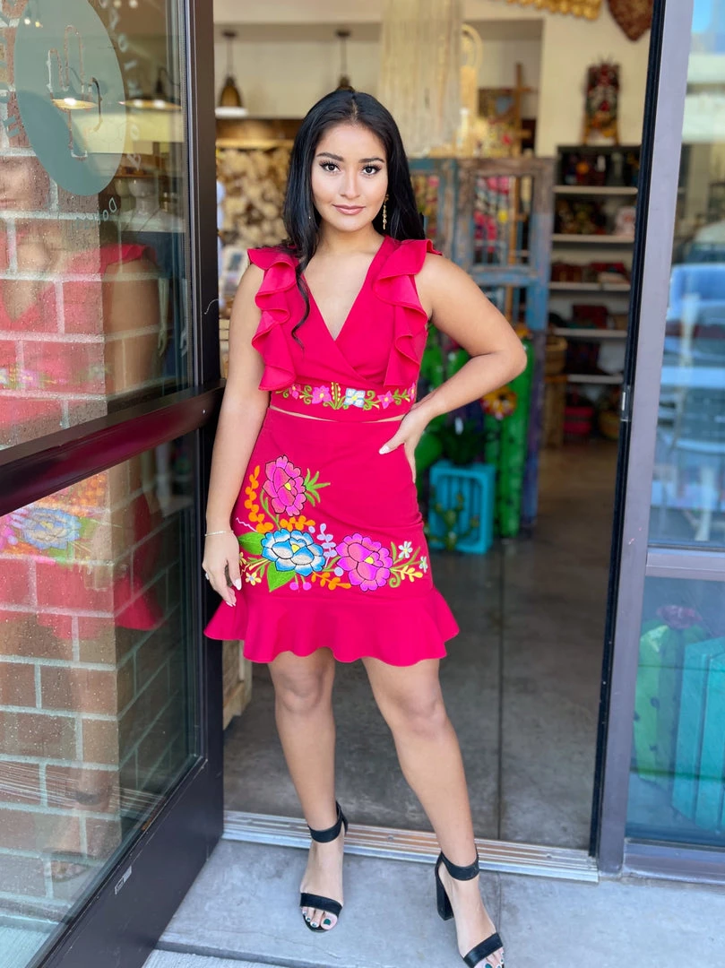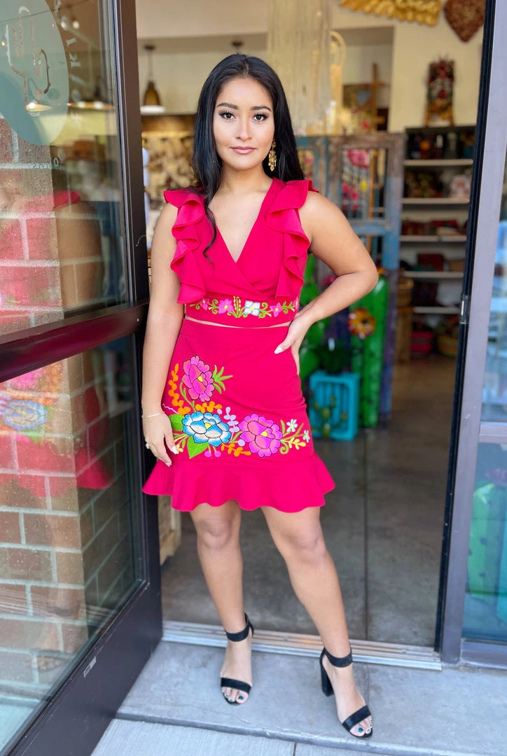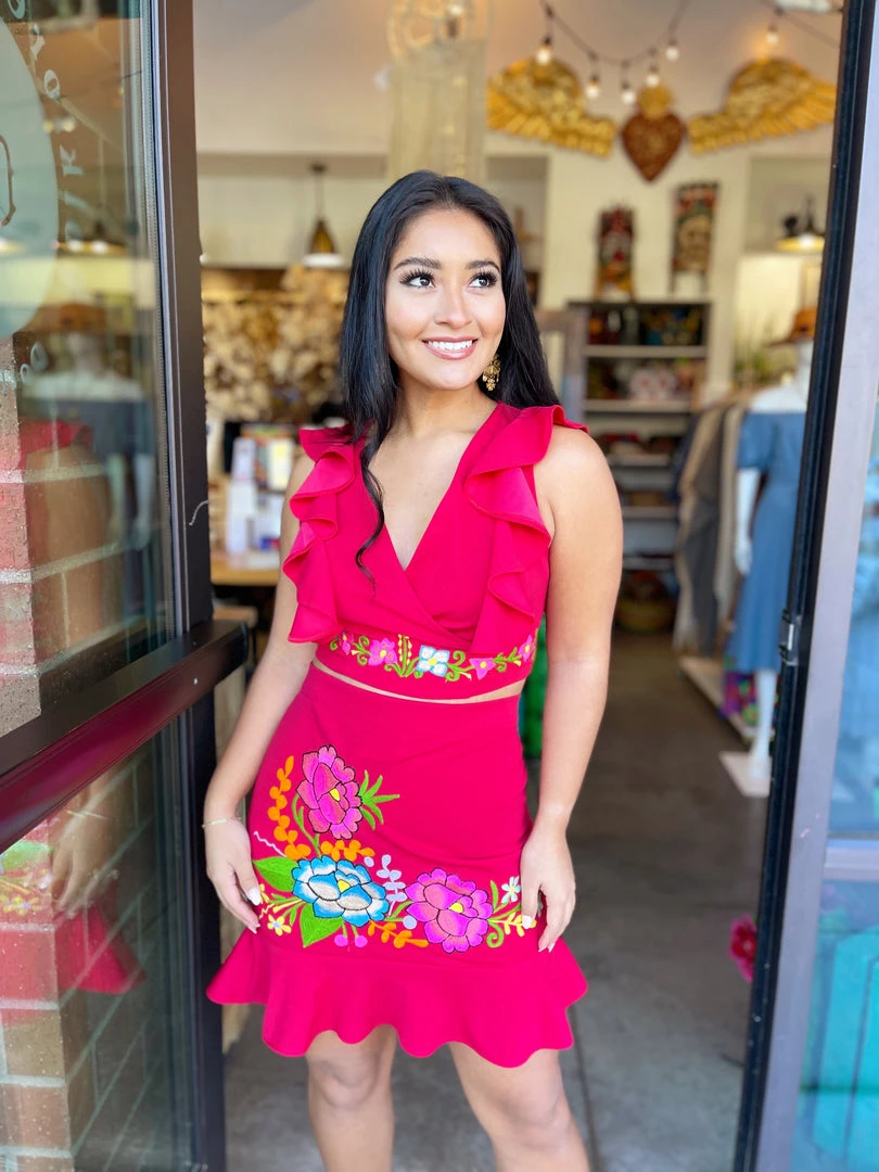 A beautiful ruffled two piece set made with one of a kind floral embroidery throughout the crop top and skirt. Set is stretchy, comfy, and sexy!