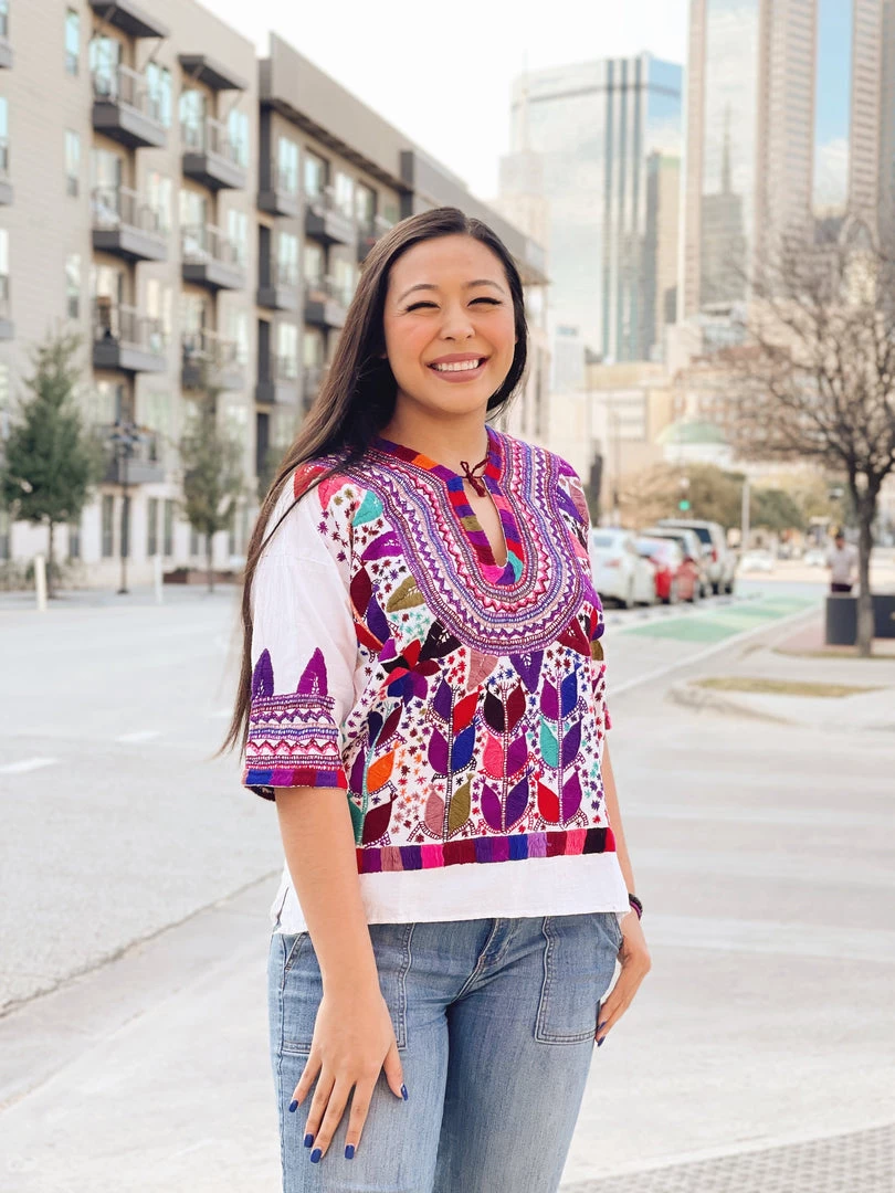 Completely handmade 3/4 sleeve blouse with brightly colored embroidery. Made with multicolored cotton embroidery thread and organic linen fabric.