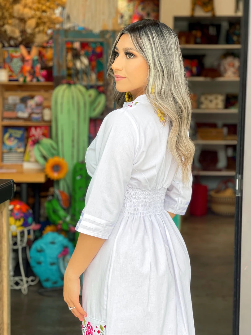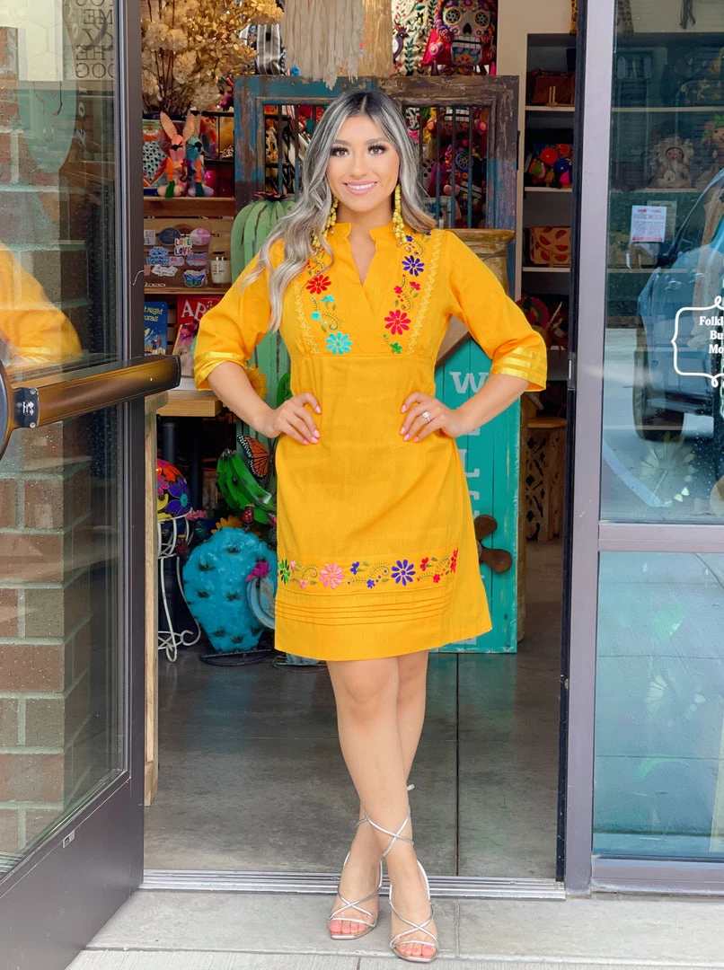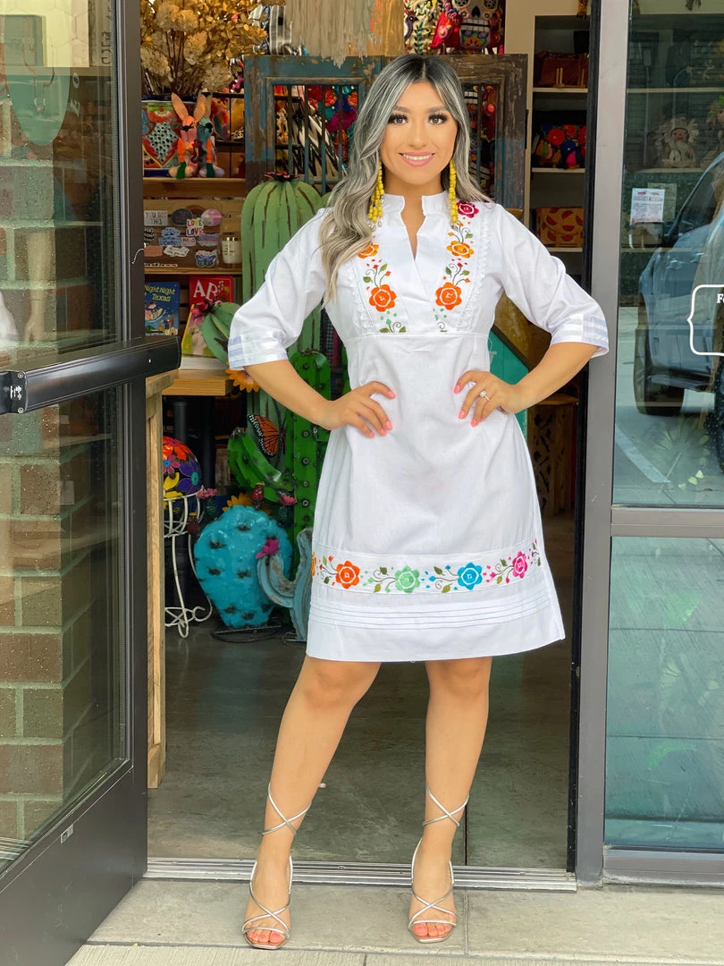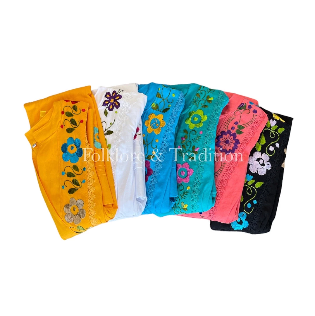 All dresses have one of a kind (multicolored) floral embroidery throughout the neckline and bottom trim. Elastic is present on the back for a more fitted, movable look. Expect variation in embroidery and embroidery color as they’re all one of a kind pieces.