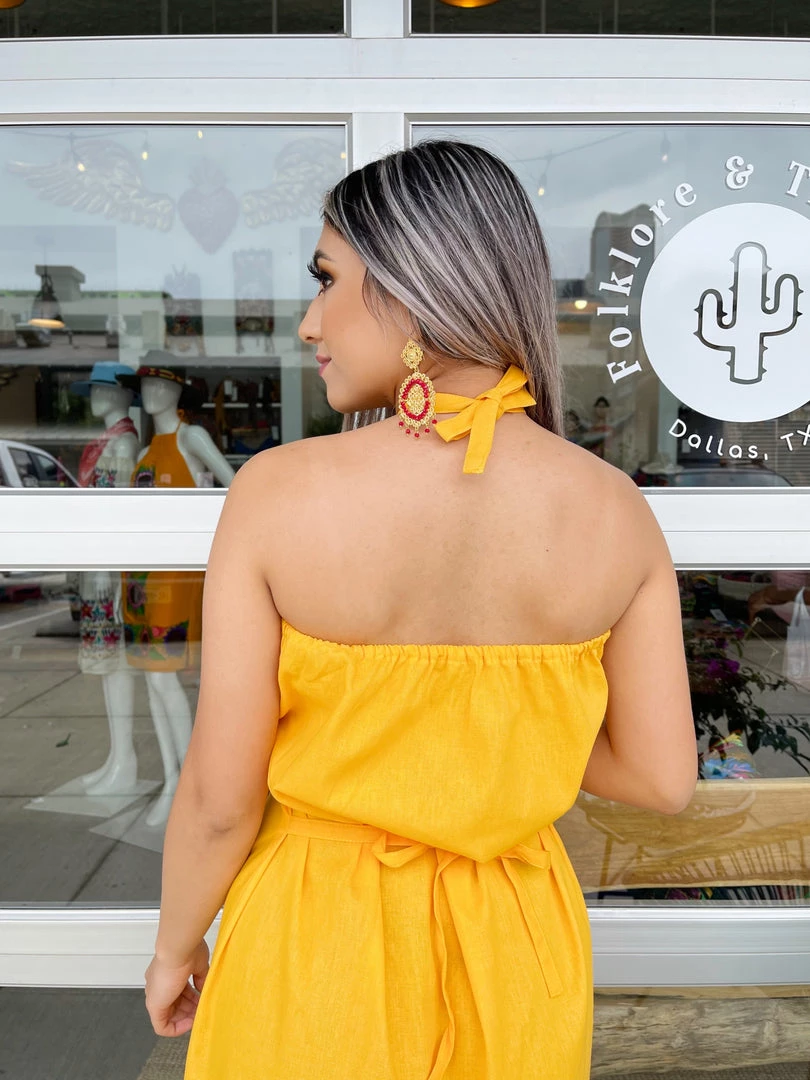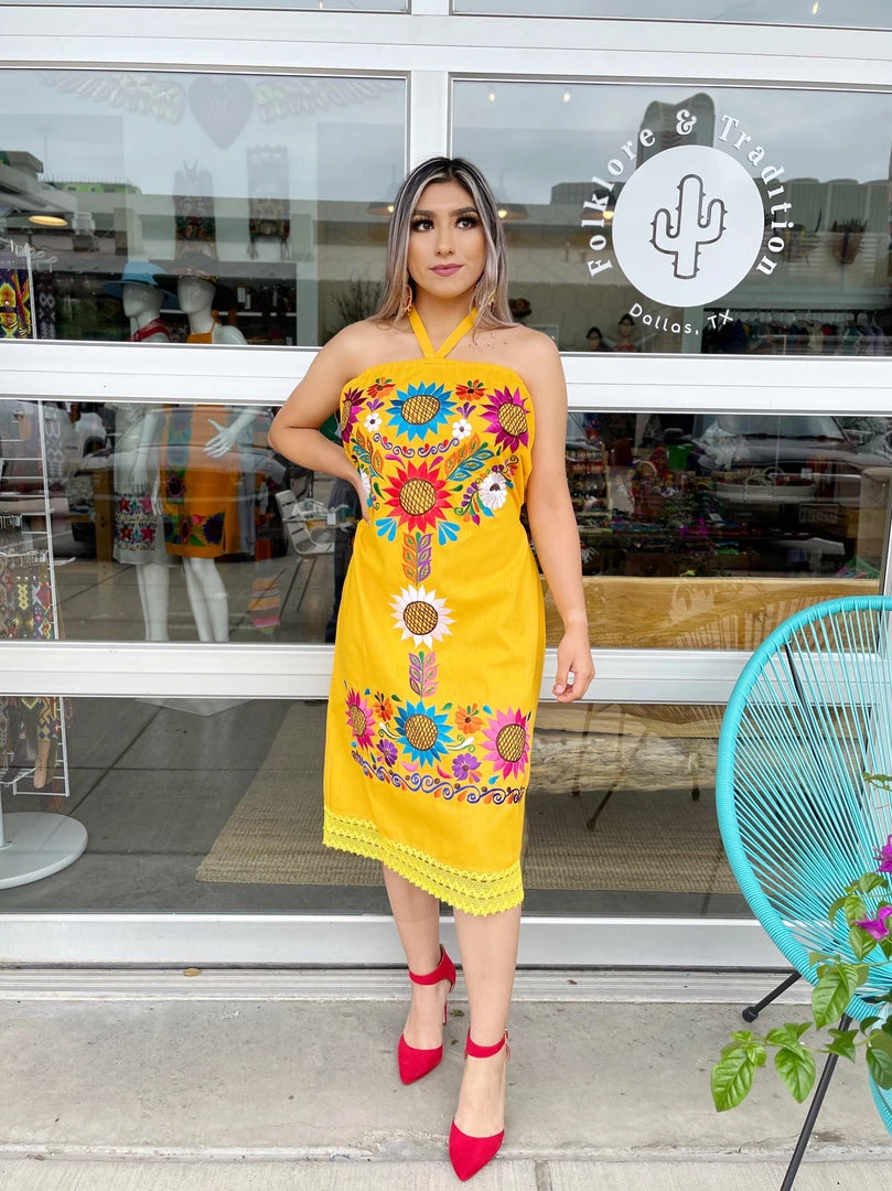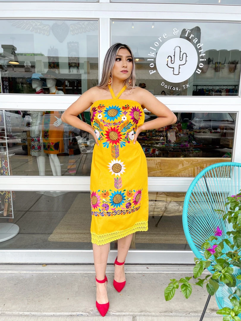The perfect sunflower dress made with dazzling bright embroidery + lace trimmings.