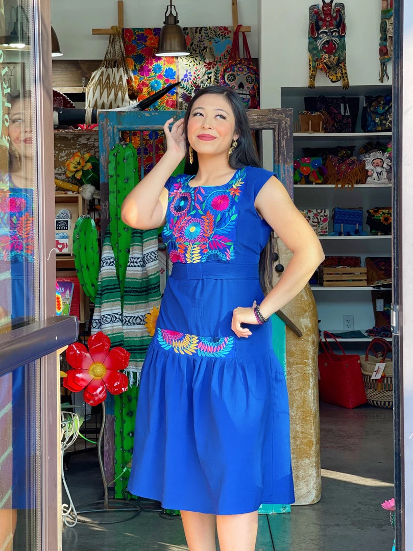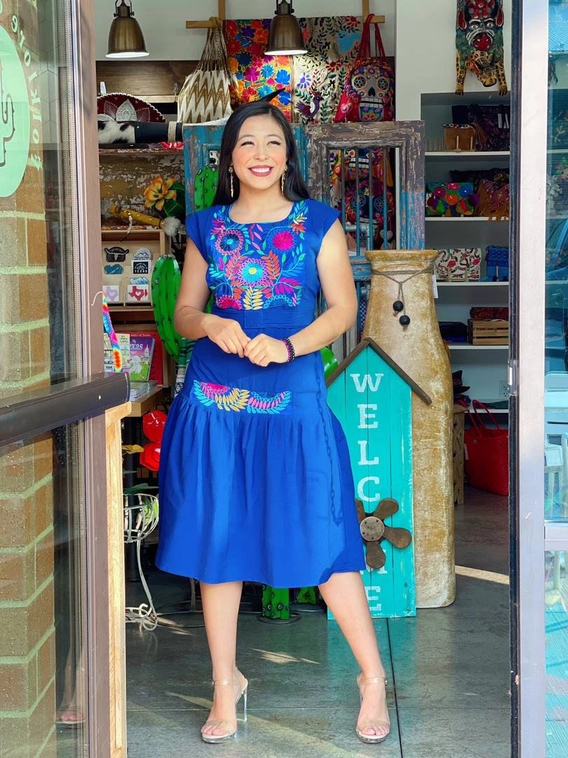 Embroidery throughout too and middle of dress, elastic back, waist straps, and ruffled dress skirt.