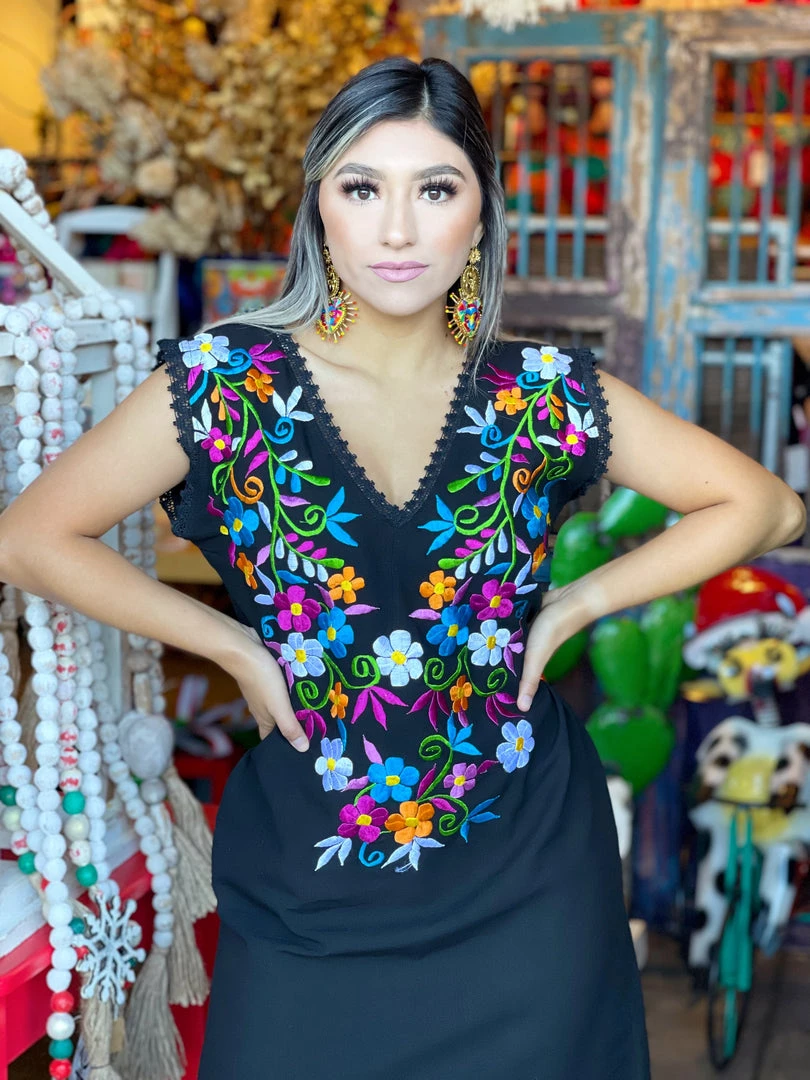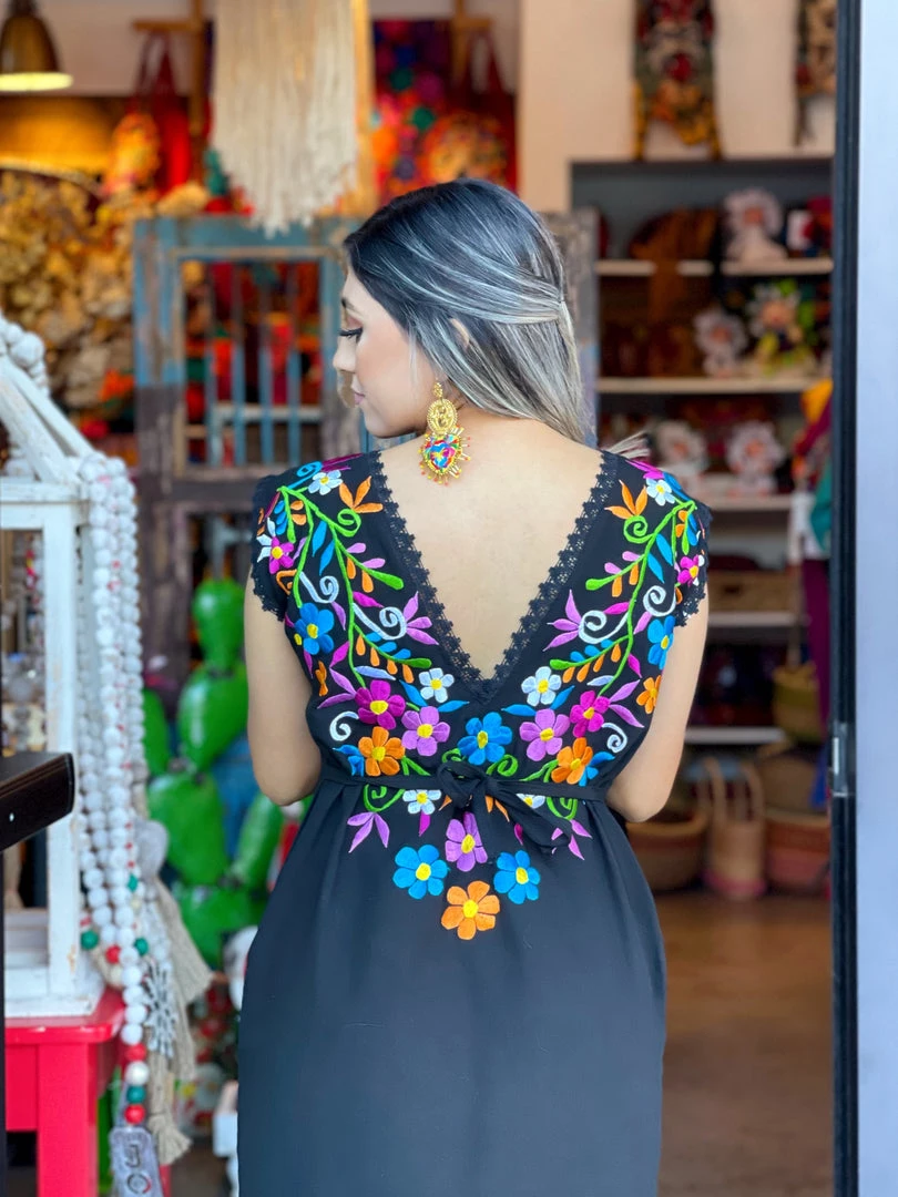 A gorgeous one of a kind dress, expect variation in embroidery color. V-neck + V-back with lace and has two straps to tie in the back to adjust to your preferred fit.