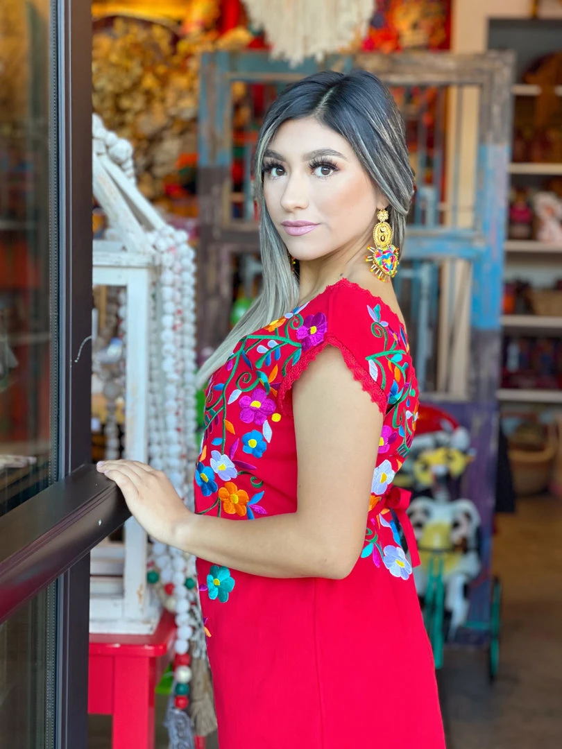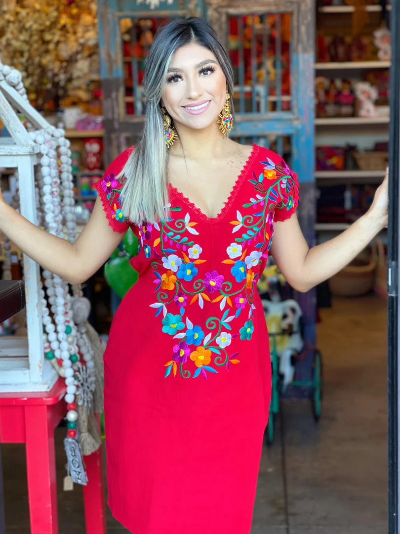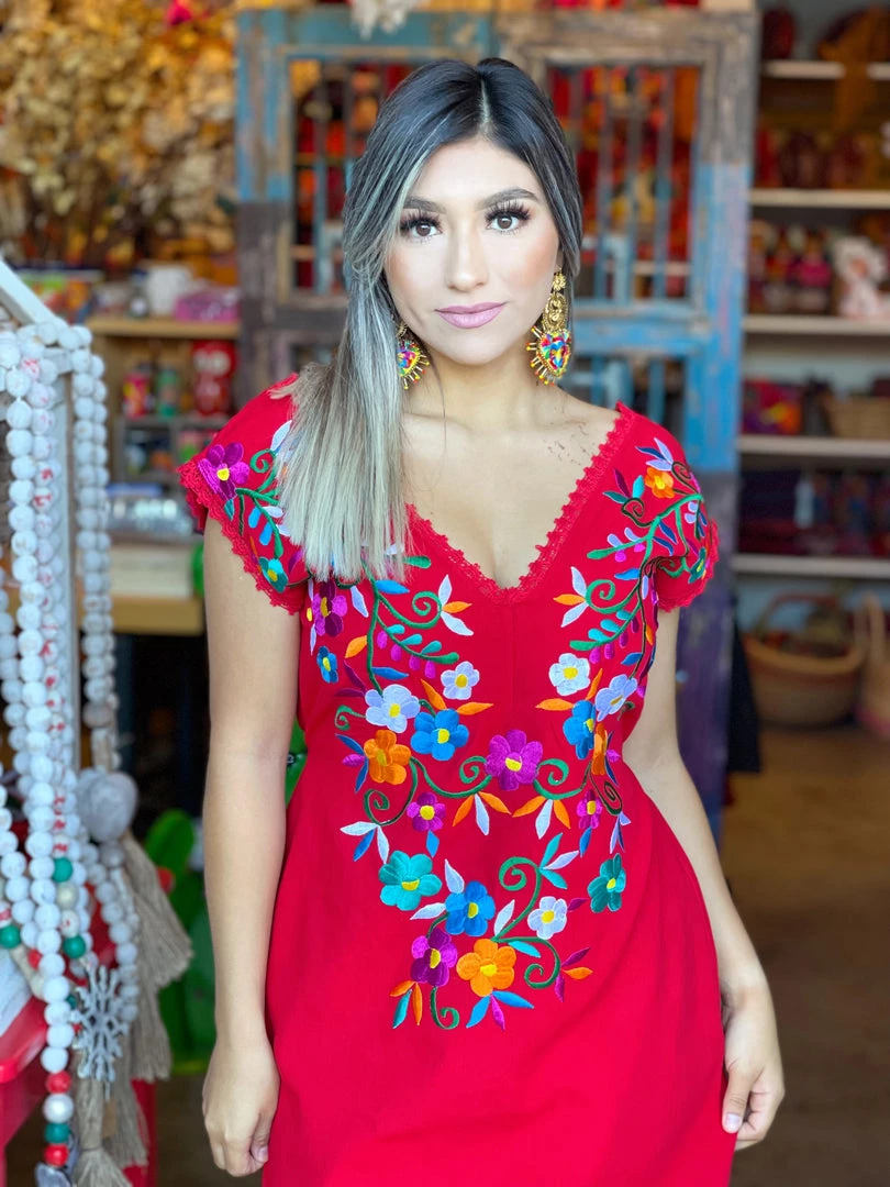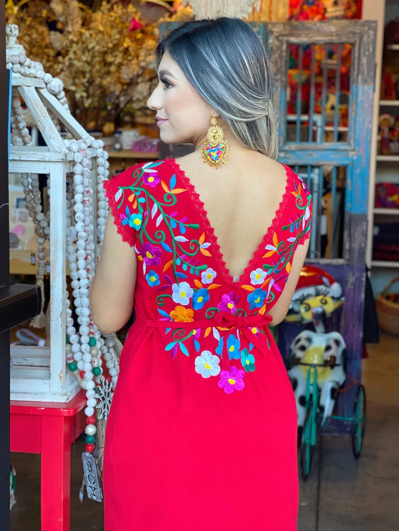 A gorgeous one of a kind dress, expect variation in embroidery color. V-neck + V-back with lace and has two straps to tie in the back to adjust to your preferred fit.
